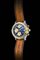 Cassa in acciaio con fondello a vite e lunetta girevole in oro. Quadrante blu con indici geometrici luminescenti, datario al 3, secondi continui al 9, 12 ore al 6 e 24 al 12.