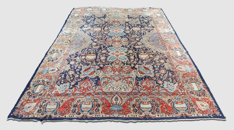 TAPPETO PERSIANO fondo blu, campo con fiori ed uccelli nei toni del rosa e dell'azzurro, lieve difetto sulla bordura cm 380x300 PERSIAN CARPET