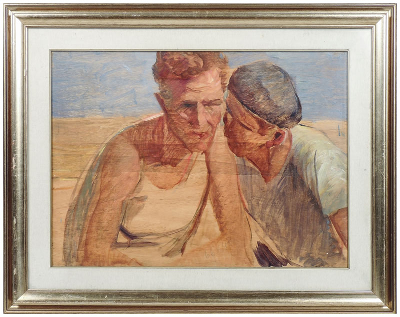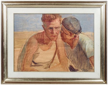 GAETANO SPINELLI (1887- 1945) Due pescatori bozzetto ad olio su tavoletta, in cornice cm 66x48 TWO FISHERMEN, OIL SKETCH ON PANEL