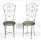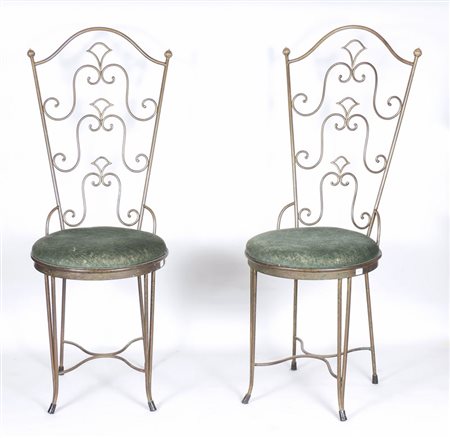SERIE DI TRE SEDIE IN METALLO DORATO Anni Cinquanata alto schienale con cartella a volute contrapposte, gambe riunite da traverse mosse, seduta imbottita e rivestita in velluto verde, difetti A SET OF THREE GILDED METAL CHAIRS, FIFTIES