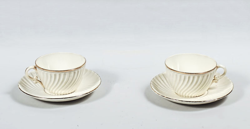 SERIE DI SEI TAZZE DA TE IN TERRAGLIA Laveno con bordini dorati, corredate di piattini, difetti A SET OF SIX POTTERY TEA CUPS