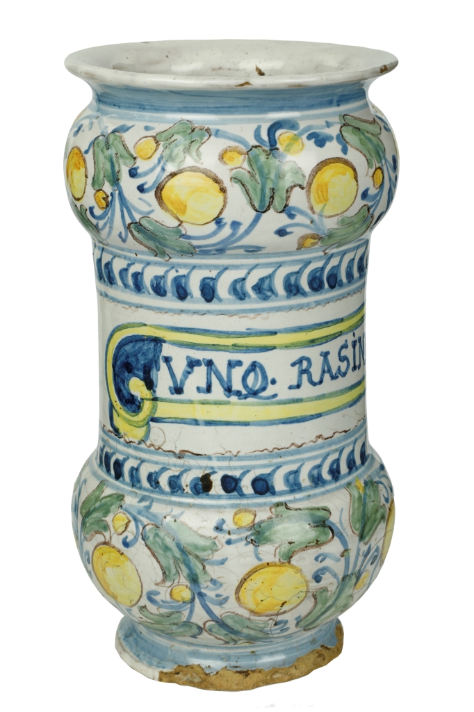 Albarello decorato con girali fioriti e pomi dorati. Al centro cartiglio indicante denominazione del farmaco contenuto " UNQ.RASINO", tracciato in lettere capitali inizi del XVII secolo.