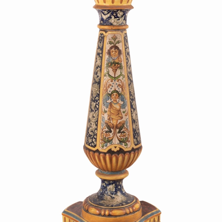 Colonna in maiolica di area metaurense con decori a raffaellesche policrome ispirate alla maiolica di Urbino della seconda metà del Cinquecento. cm 98,5x40; alla sommità Ø cm 27