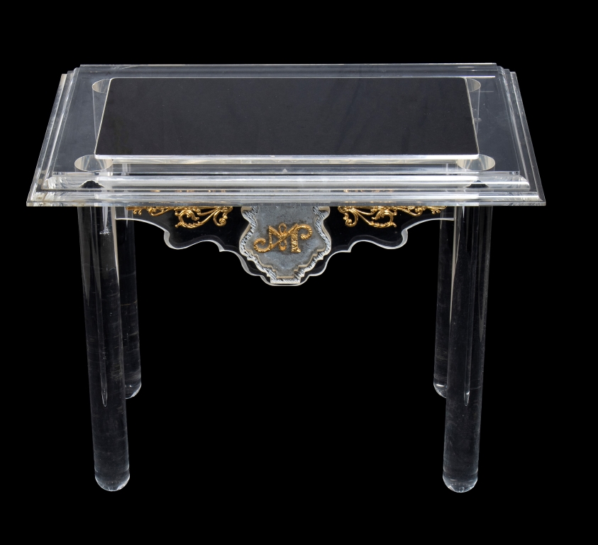 Tavolino in plexiglass trasparente con particolare grambiale sagomato e decoro con monogramma di Max Papiri cm 64x79,5x50