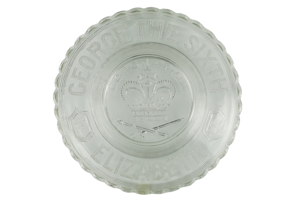 Set di 12 piatti commemorativi in vetro realizzati in occasione dell' incoronazione di Giorgio VI nel 1937 diametro cm 24