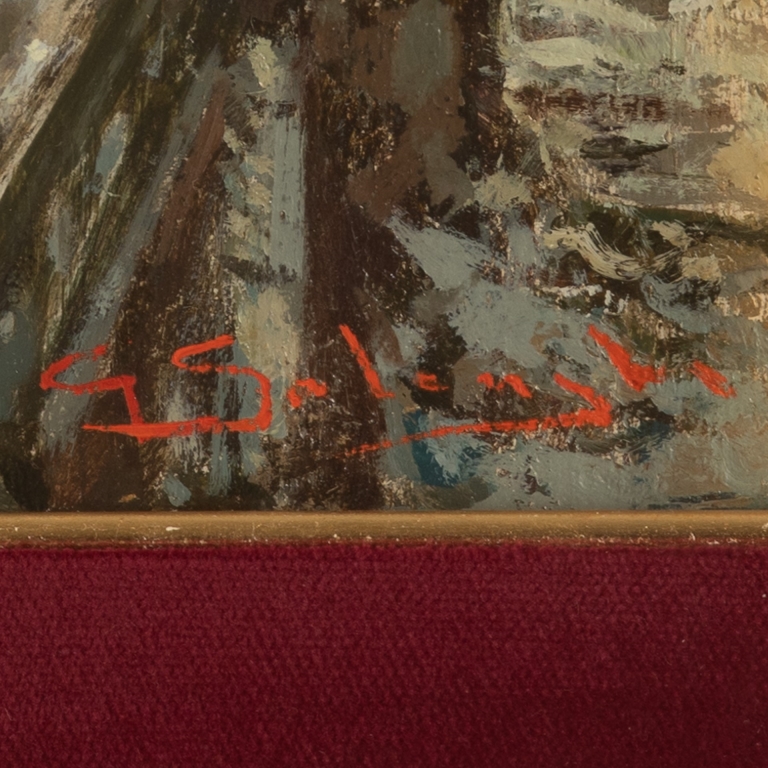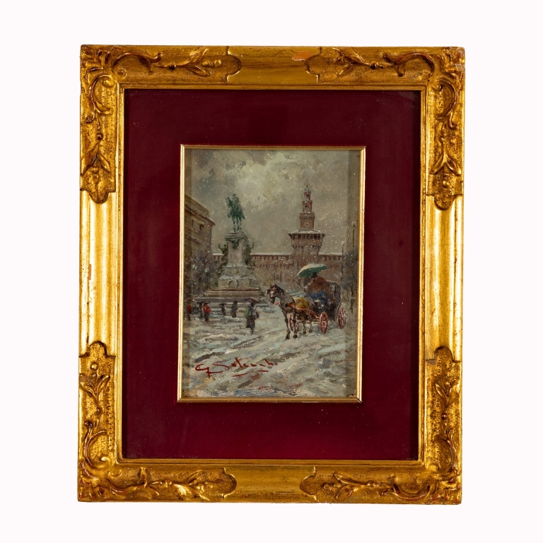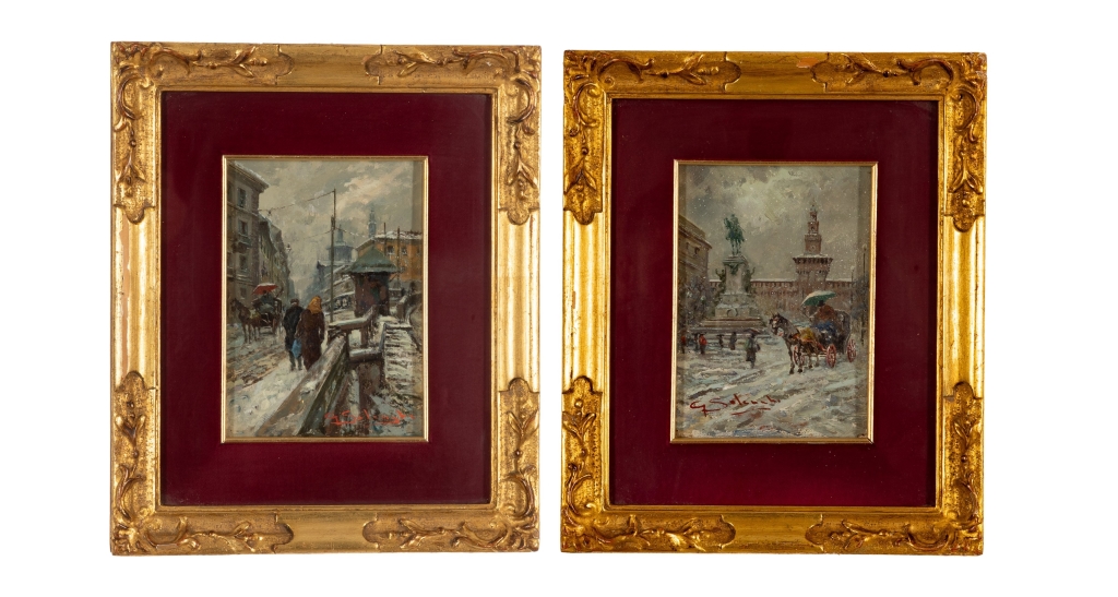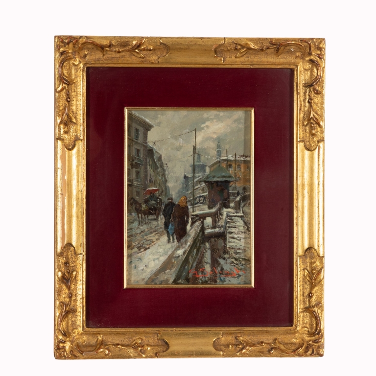Giuseppe Solenghi (1879 - 1944) Coppia di dipinti raffiguranti strade innevate di città olio su tavola cm 14,5x19,5; con cornice cm 31,5x26,6