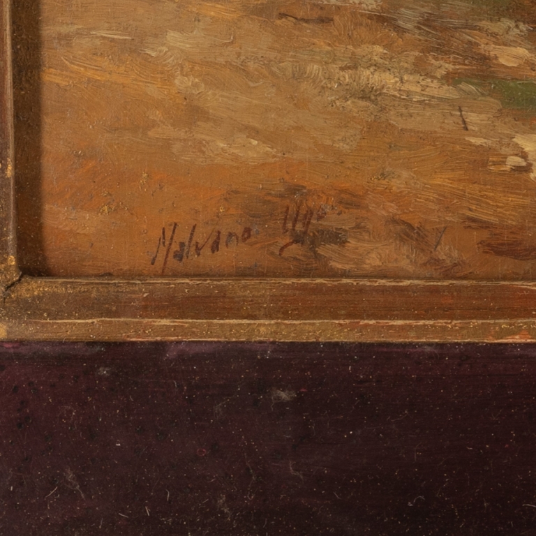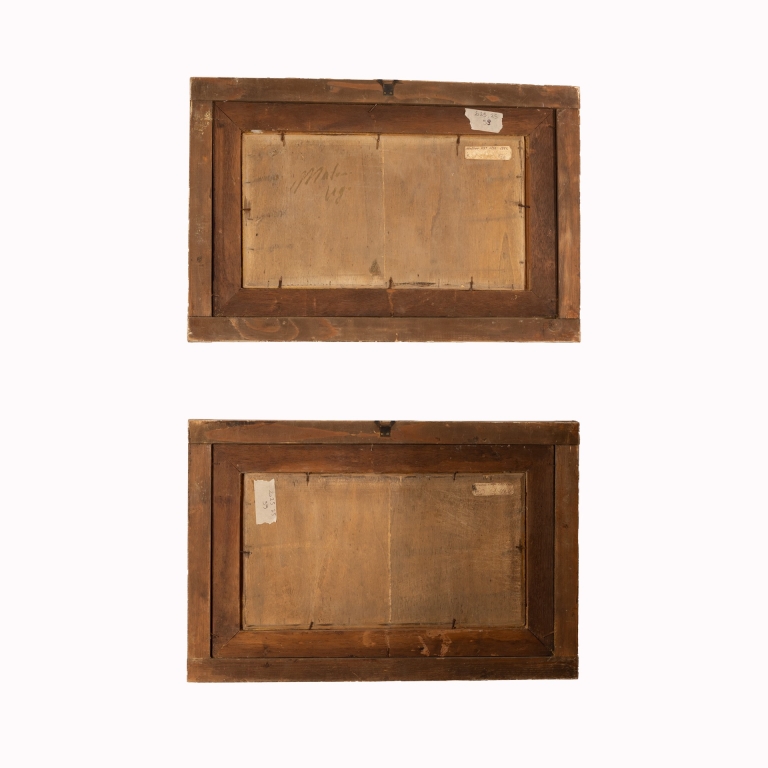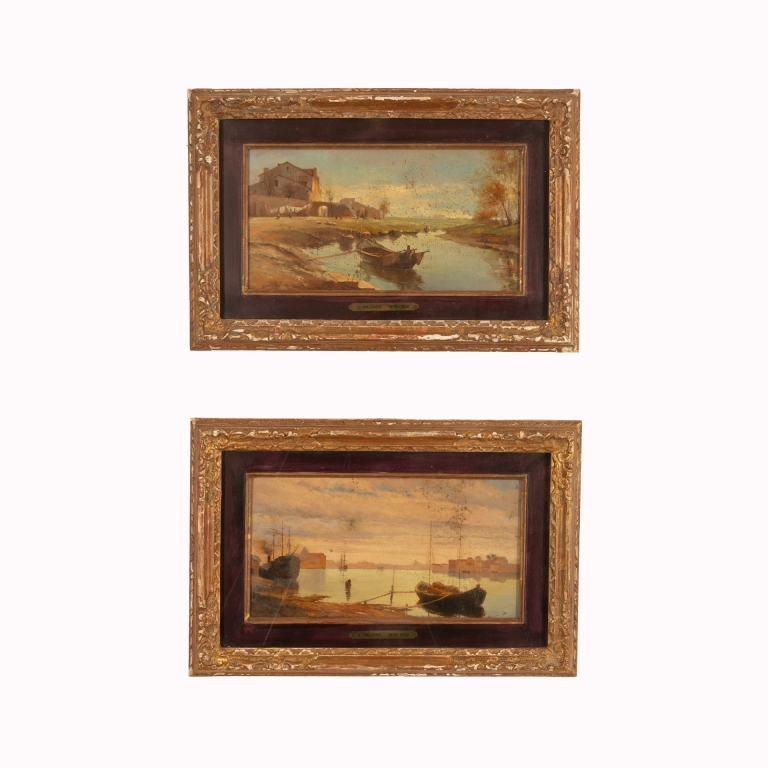 Ugo Malvano (firma_di) (Torino, 1878 - Finale Ligure, 1958) Coppia di paesaggi fluviali olio su tavola cm 19,5x34,5; con cornice cm 32x47,5