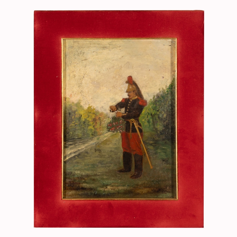 Étienne-Prosper Berne-Bellecour (Boulogne-sur-Mer, 1838 - Parigi, 1910) Ufficiale sulle rive del Savara olio su tela cm 33x24,5; con cornice cm 52x42,5