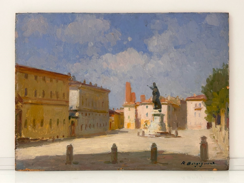 Romeo Borgognoni (Ravenna, 1875 - Pavia, 1944) Veduta di piazza con una statua olio su cartoncino cm 30x42; con cornice cm 42x53