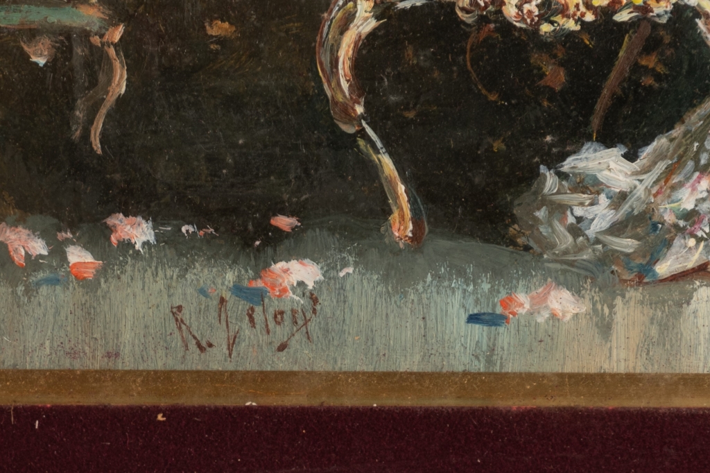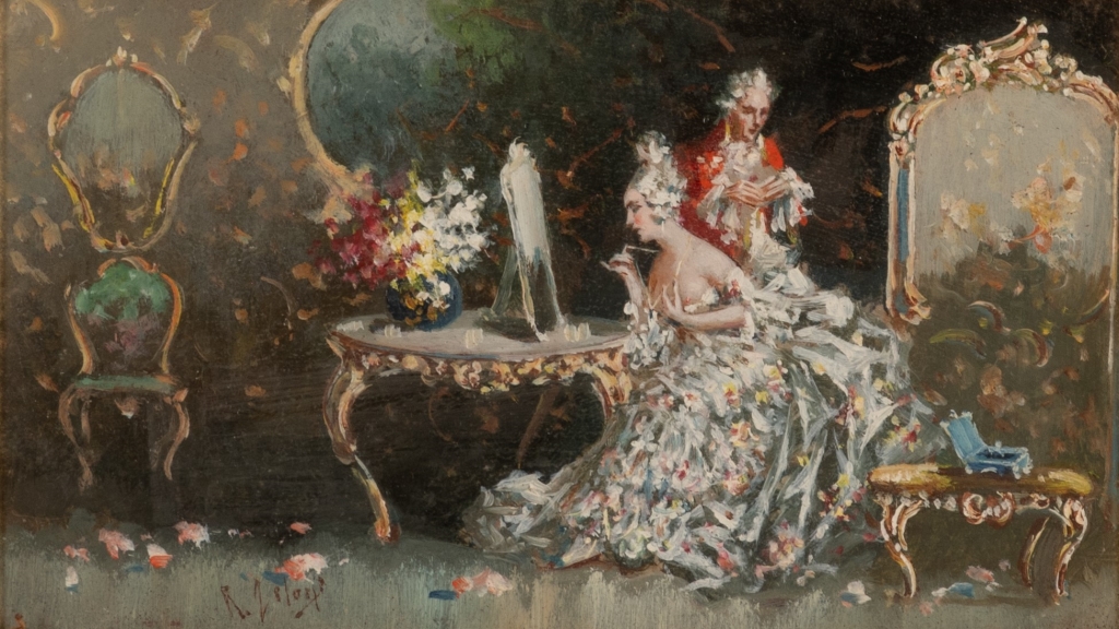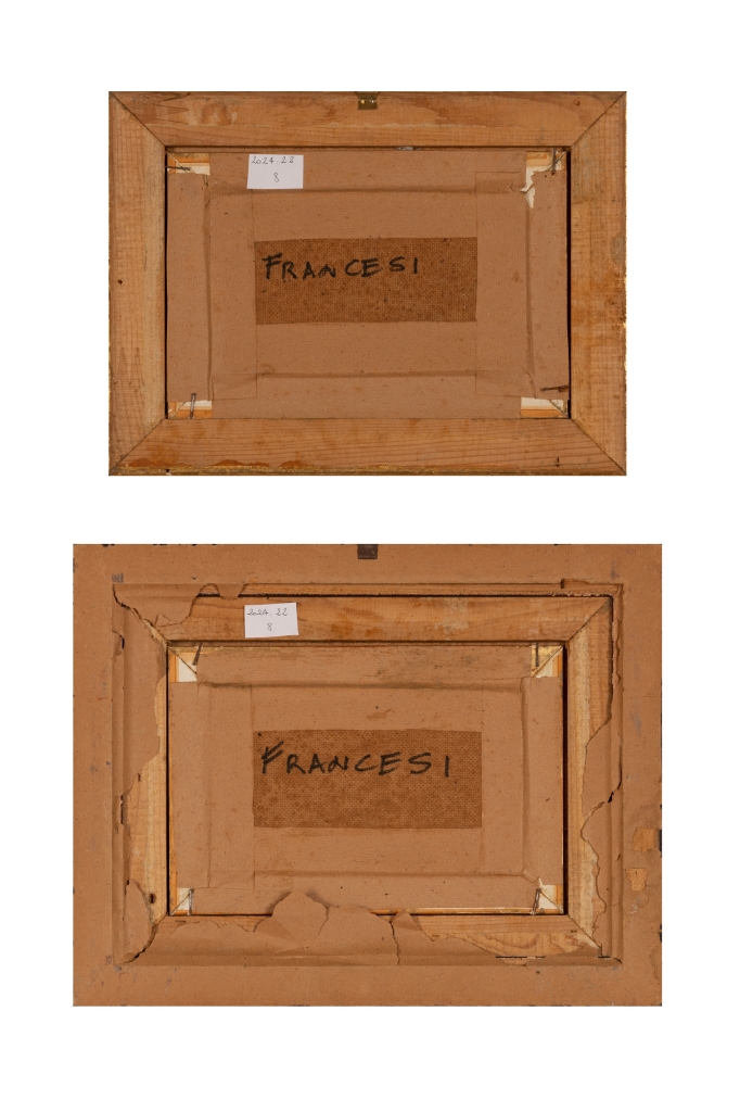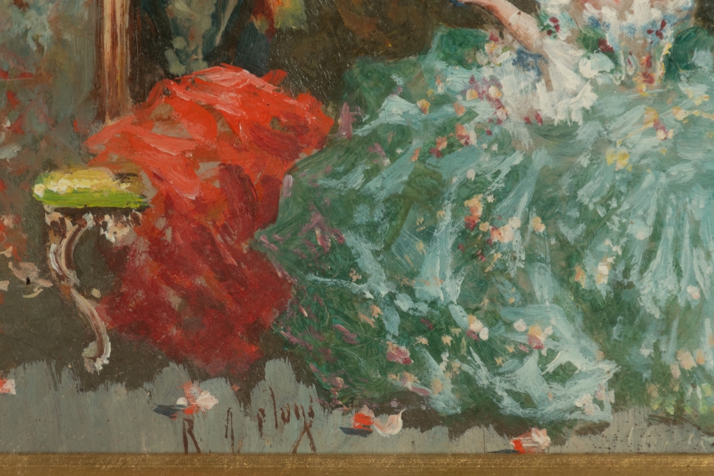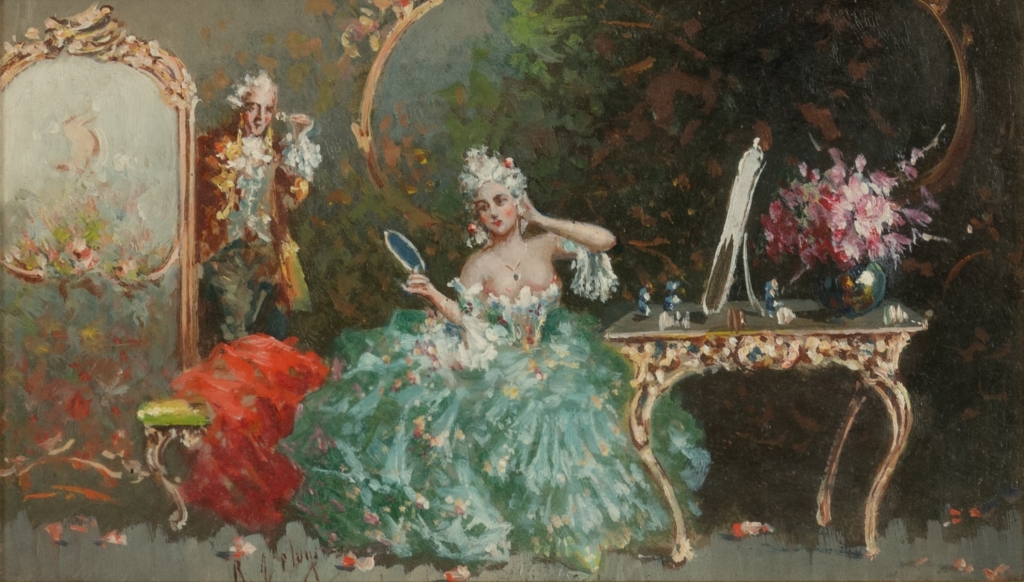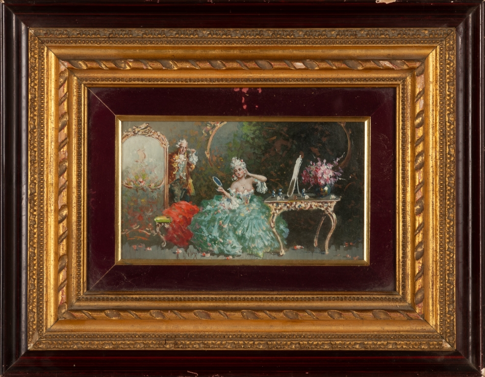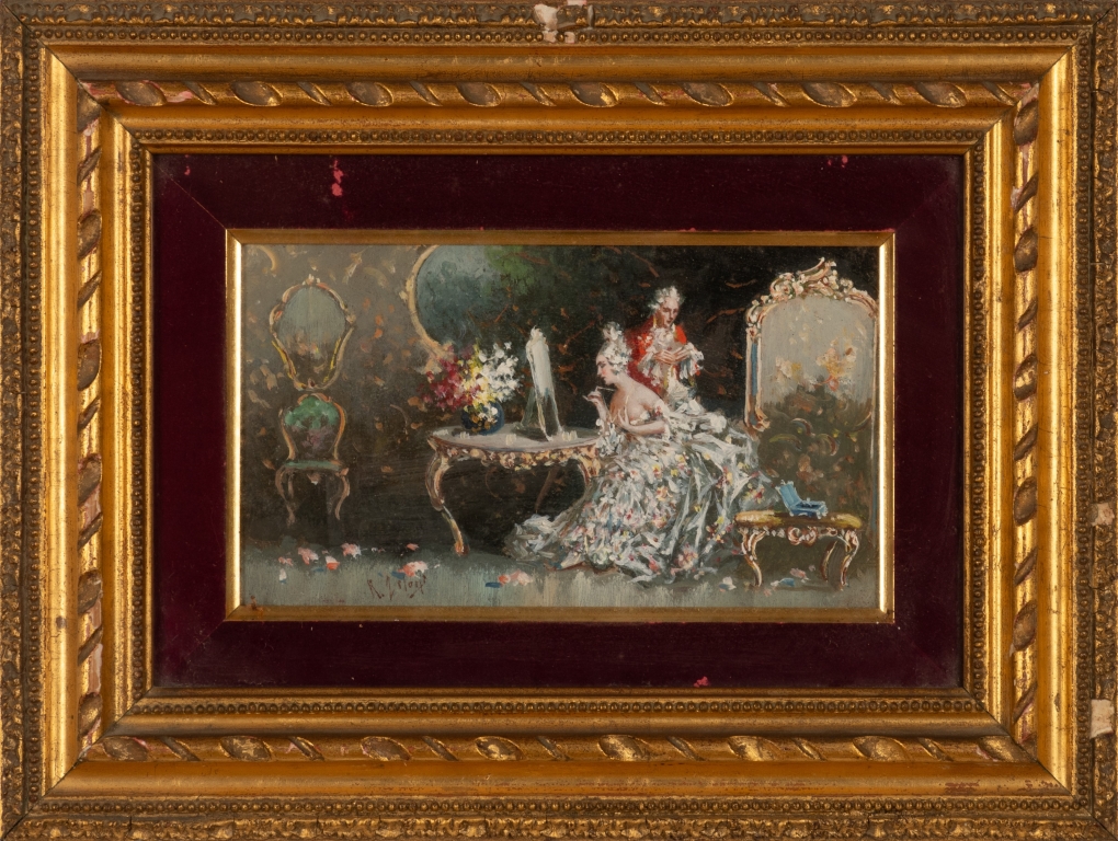 Raffaele Zeloni Coppia di dipinti olio su cartone " Preparativi per il ballo" olio su tavoletta 1) cm 12,6x21,1; con cornicecm 26,5x35,3; 2) cm 12,6x21x1; con cornice cm 31,5x40,2