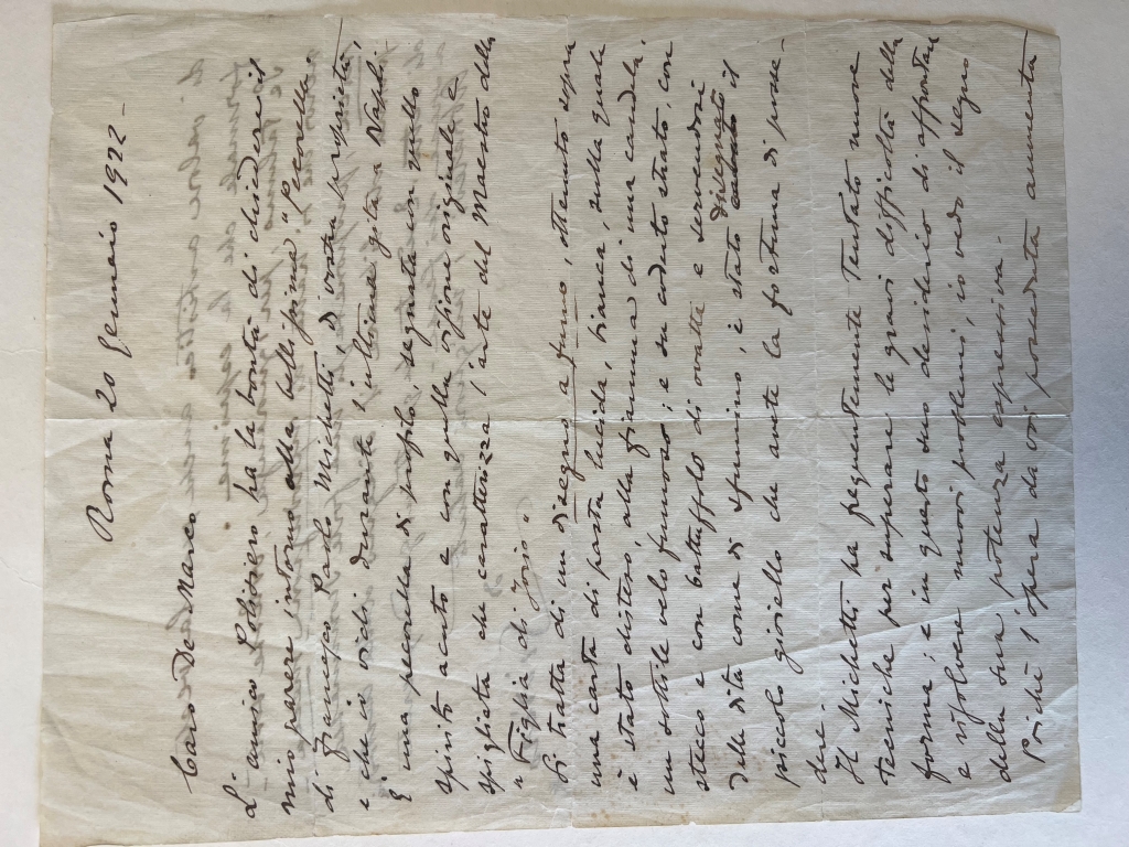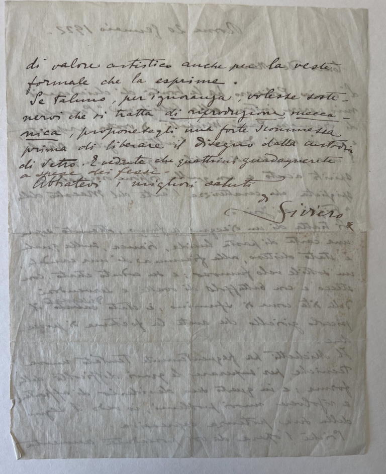 La lettera di Siviero – che accompagna l’opera in asta, e che trasse spunto da una sollecitazione del giornalista e critico d’arte Guido Polisiero – è datata 20 gennaio 1922, fornendoci così un sicuro termine ante quem per la datazione dell’opera.