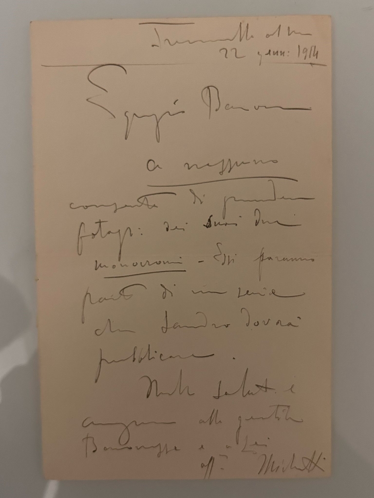 45) Cartolina postale scritta dal figlio di F.P. Michetti, Alessandro, ed indirizzata all'Egregio Barone Francesco Bonanni (Aquila) Fossa. Al retro Francavilla 8 agosto 1928 Carissimo Francesco. Oggi Papà mi ha scritto una bella testa a bianco e nero per inviartela, e ti prego dirmi se preferisci venirla a prenderla in una tua prossima gita, o vuoi te la mandi ben imballata per ferrovia. Felici di aver soddisfatto il tuo desiderio caramente noi ti salutiamo tuo aff. Alessandro