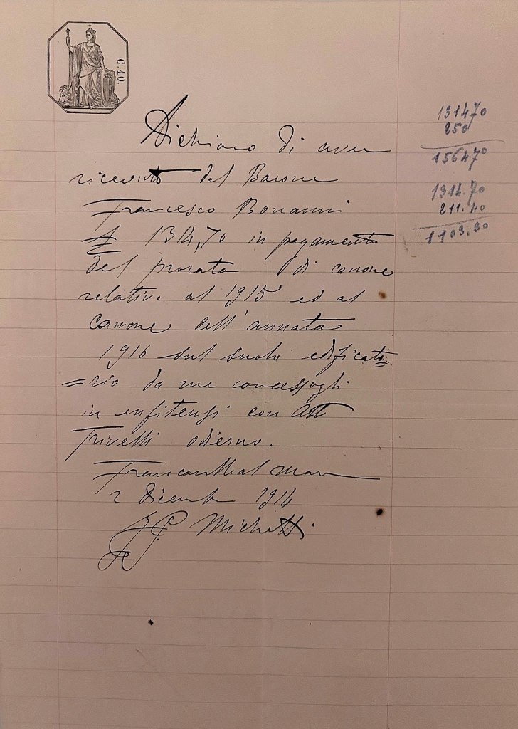 37) Ricevuta su carta uso bollo da 10 centesimi datata 2 dicembre 1914 firmata da F.P. Michetti. Nella stessa il pittore dichiara "di aver ricevuto dal Barone Francesco Bonanni lire 1.314,70 in pagamento del prorata di canone relativo al 1915 ed al canone dell'annata 1916 sul suolo edificatorio da me concessogli in enfiteusi atto Trivelli odierno. Francavilla al Mare 2 dicembre 1914 F.P.Michetti.