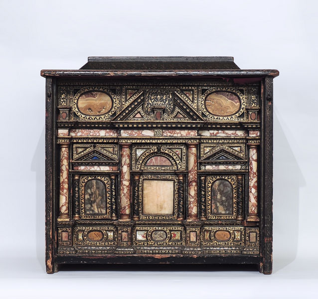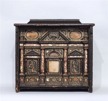 IMPORTANTE STIPO MONETIERE IN LEGNO LACCATO A FINTO EBANO, MARMI RARI E MADREPERLA Venezia, ultimo quarto del XVI secolo interamente lumeggiato in oro con decorazione "alla persiana" con la tecnica della lacca dorata, la calatoia rivela un fronte architettonico centrato da edicola sormontata da timpano spezzato e sostenuta da colonne tra tiretti impreziositi da inserti in breccia corallina, alabastro, lapislazzuli e madreperla dipinta con motivo floreali, il coperchio cela vano portacarte con segreti, lievi imperfezioni h cm 48x51x38 IMPORTANT INLAID RARE MARBLES, LAQUERED, PAINTED, GILTWOOD CABINET, VENICE, LAST QUARTER OF 16TH CENTURY Bibliografia - Literature: H. Huth, Europäische Lacarbeiten 1600-1850. Brunswick: 1955. H.Huth, Lacquer of the West, The History of an Art and a Craft 1550-1950. Chicago & London: 1971. A. González-Palacios, Il Tempio del Gusto. Milano: 1986. Venezia e l'Islam, catalogo della mostra. Venezia: 2007. W. Koeppe -A. Giusti, Art of the Royal Court, catalogo della mostra. Metropolitan Museum of Art, New York: 2008, cat. 21. Per esemplare simile cfr: Old Master Paintings, XIX Century Paintings, Furniture, Ceramics and Works of Art and Books. Sotheby's, Milano, asta del 9-10 giugno 2009, lotto 159.