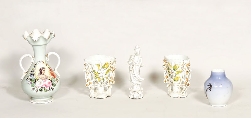 LOTTO DI OGGETTI IN PORCELLANA una coppia di piccoli vasi decorati con fiori a rilievo, una figura in porcellana cinese di divinità con fiore di loto ed altri due piccoli vasi, difetti (5) PORCELAIN LOT