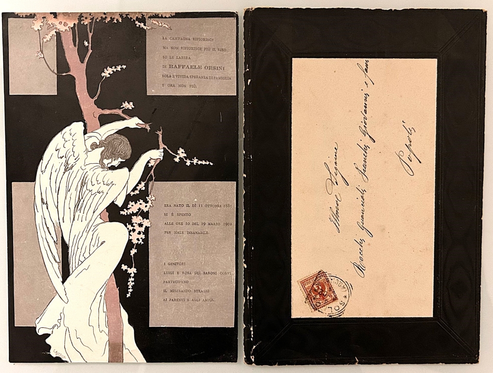 Lot 581 | Basilio Cascella (Pescara, 1860 - Roma, 1950) Necrologio artistico realizzato su cartoncino per la morte di Raffaele Orsini cm 23,2x15,2