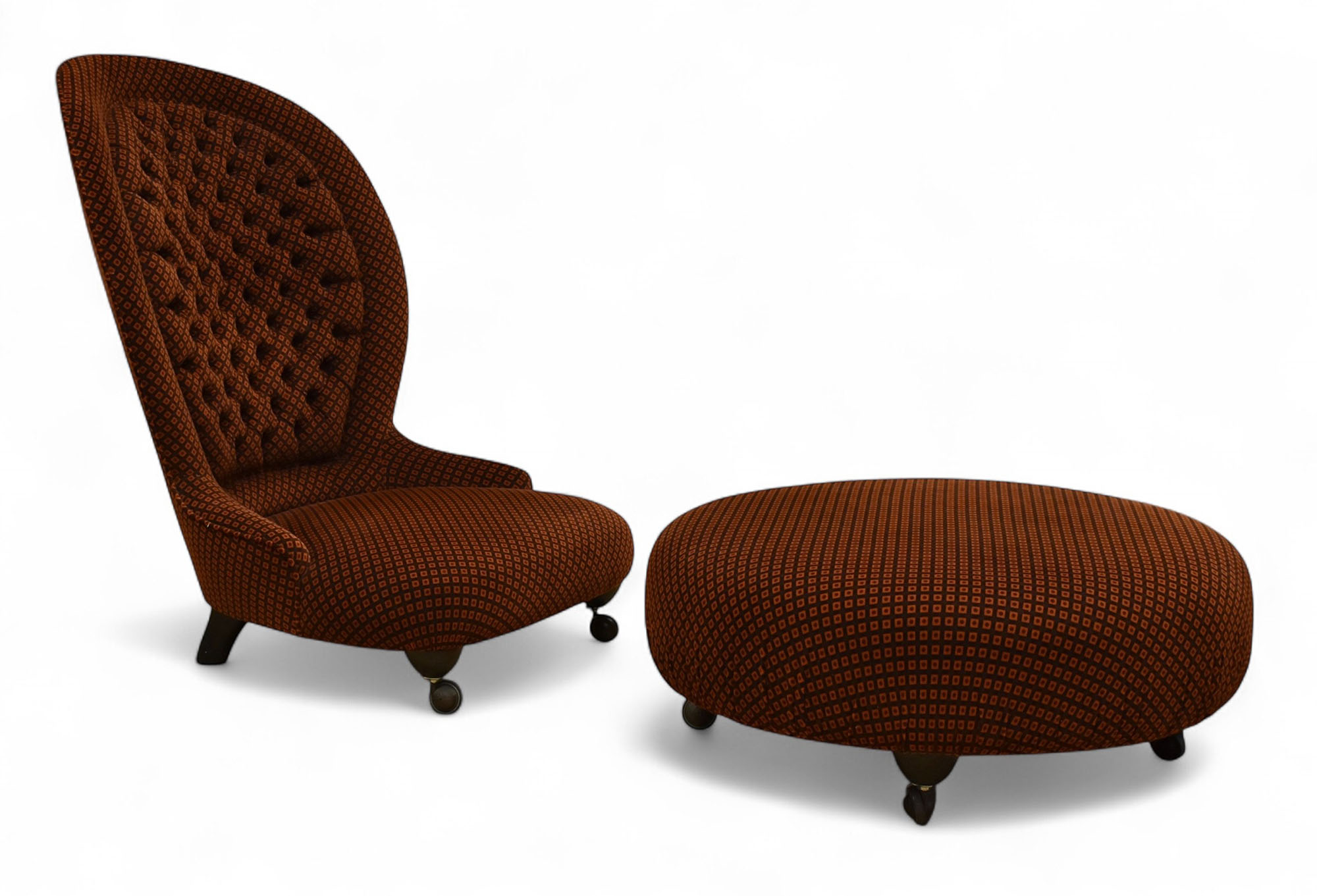Poltrona + pouf rotondo in legno e tessuto mod. Pole Position Azucena anni '80 / '90