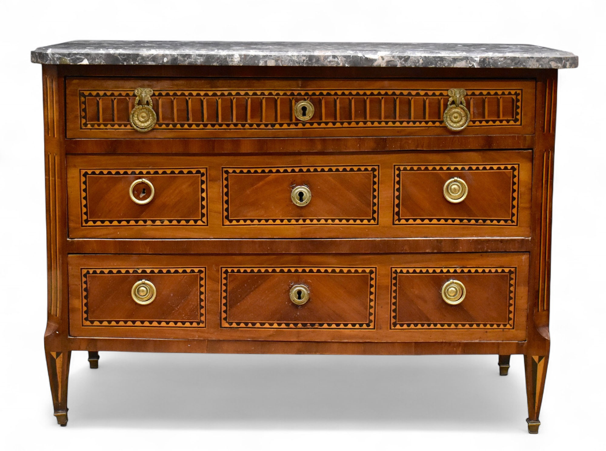 Cassettone intarsiato a motivi geometrici piano in mermo epoca Luigi XVI Francia sec. XVIII