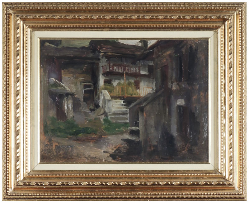 LORENZO DELLEANI (1840-1908) Paese piemontese olio su tavoletta, in cornice cm 27x36,8 Al verso reca iscrizioni PIEDMONTESE VILLAGE, OIL ON PANEL, WITH INSCRIPTIONS ON REVERSE