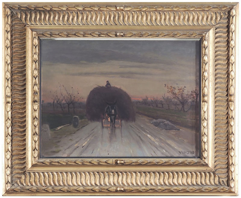 GIULIO CESARE VINZIO (1881-1940) Scorcio di strada di campagna con carro olio su tavoletta, al verso reca piccolo bozzetto a matita raffigurante bambina, firmato, in cornice cm 33x45 COUNTRY PATH VIEW WITH CARRIAGE, OIL ON PANEL