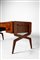 Scrivania curva a cinque cassetti in legno impiallacciato con copri piano in vetro sagomato e molato