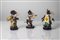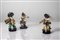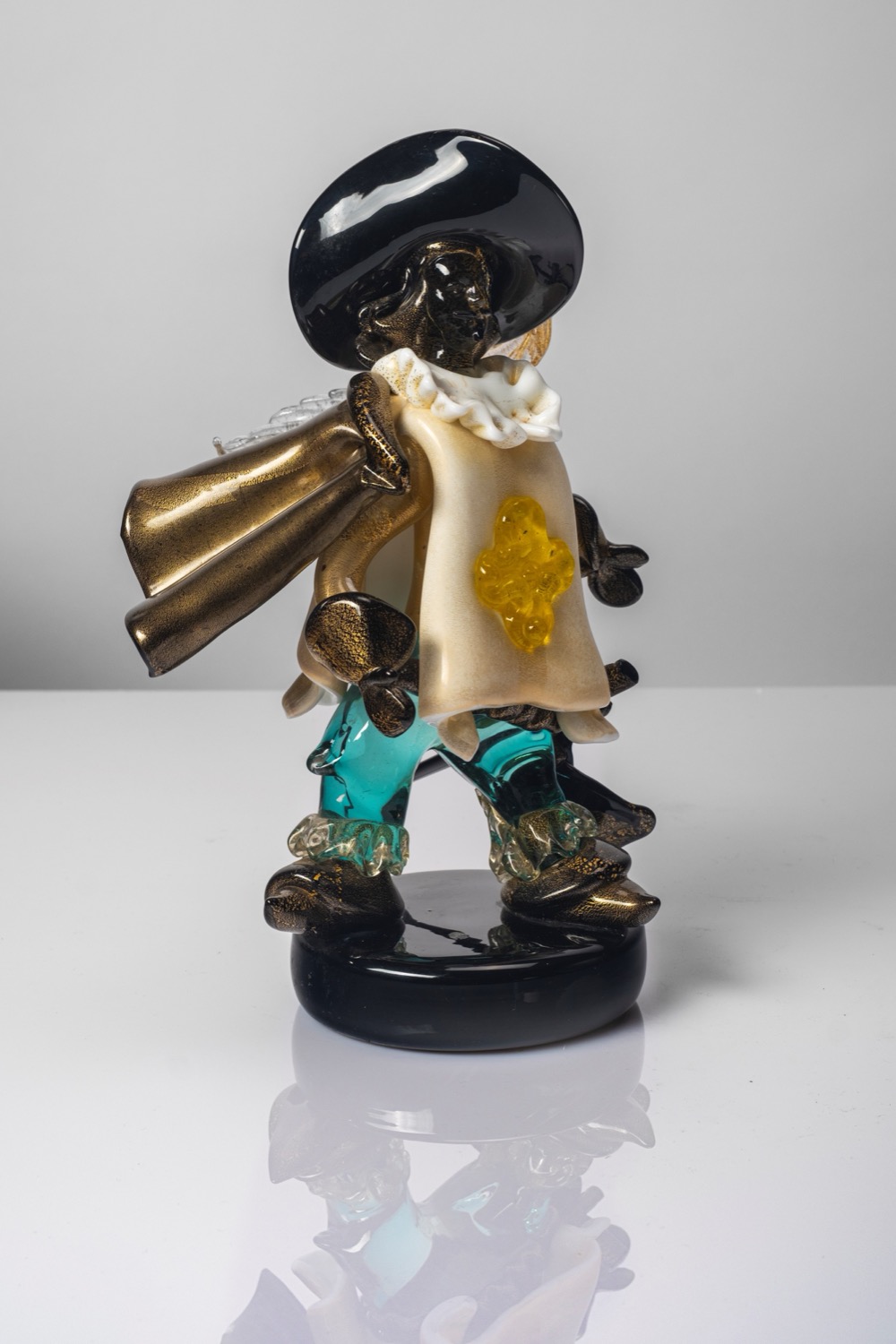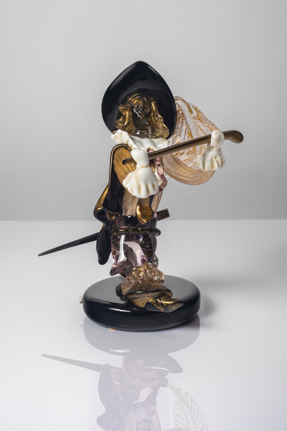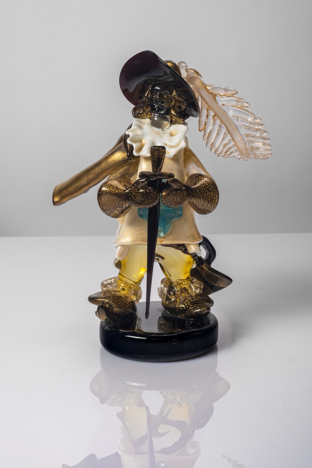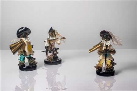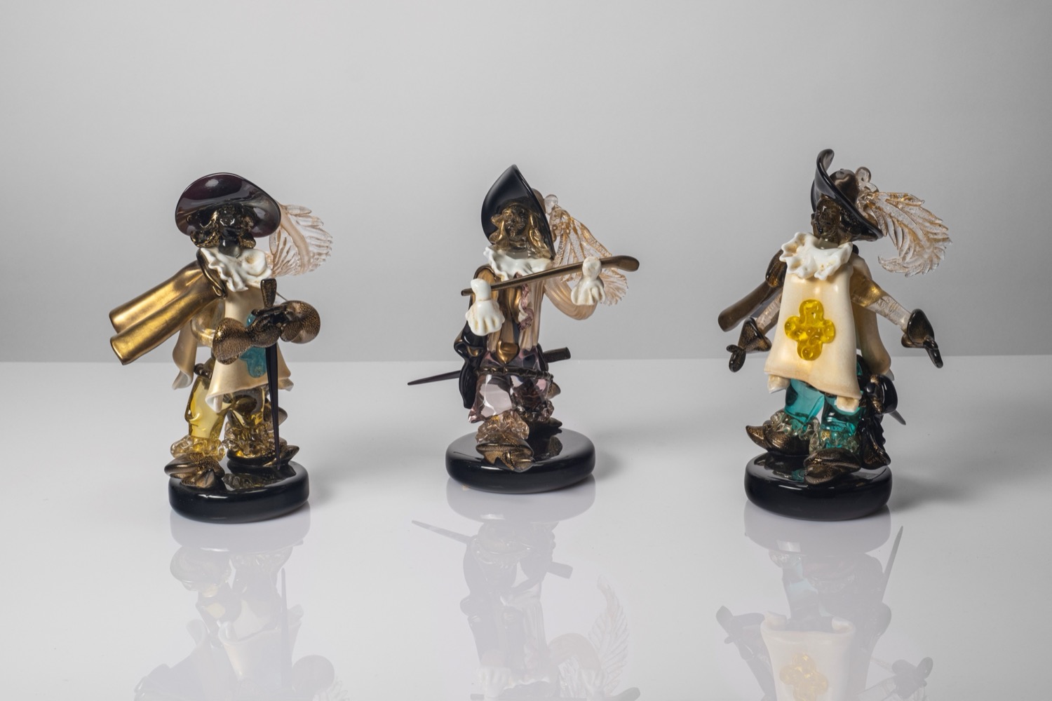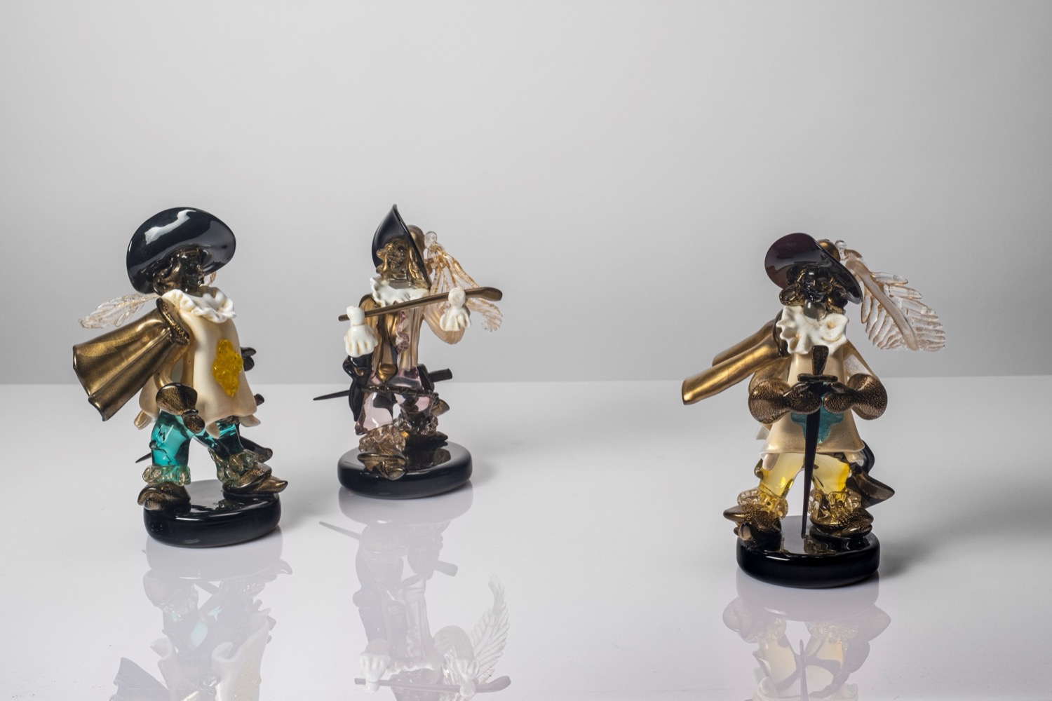 Tre figure in vetro rappresentanti moschettieri in pasta vitrea policroma con decoro a foglia d’oro