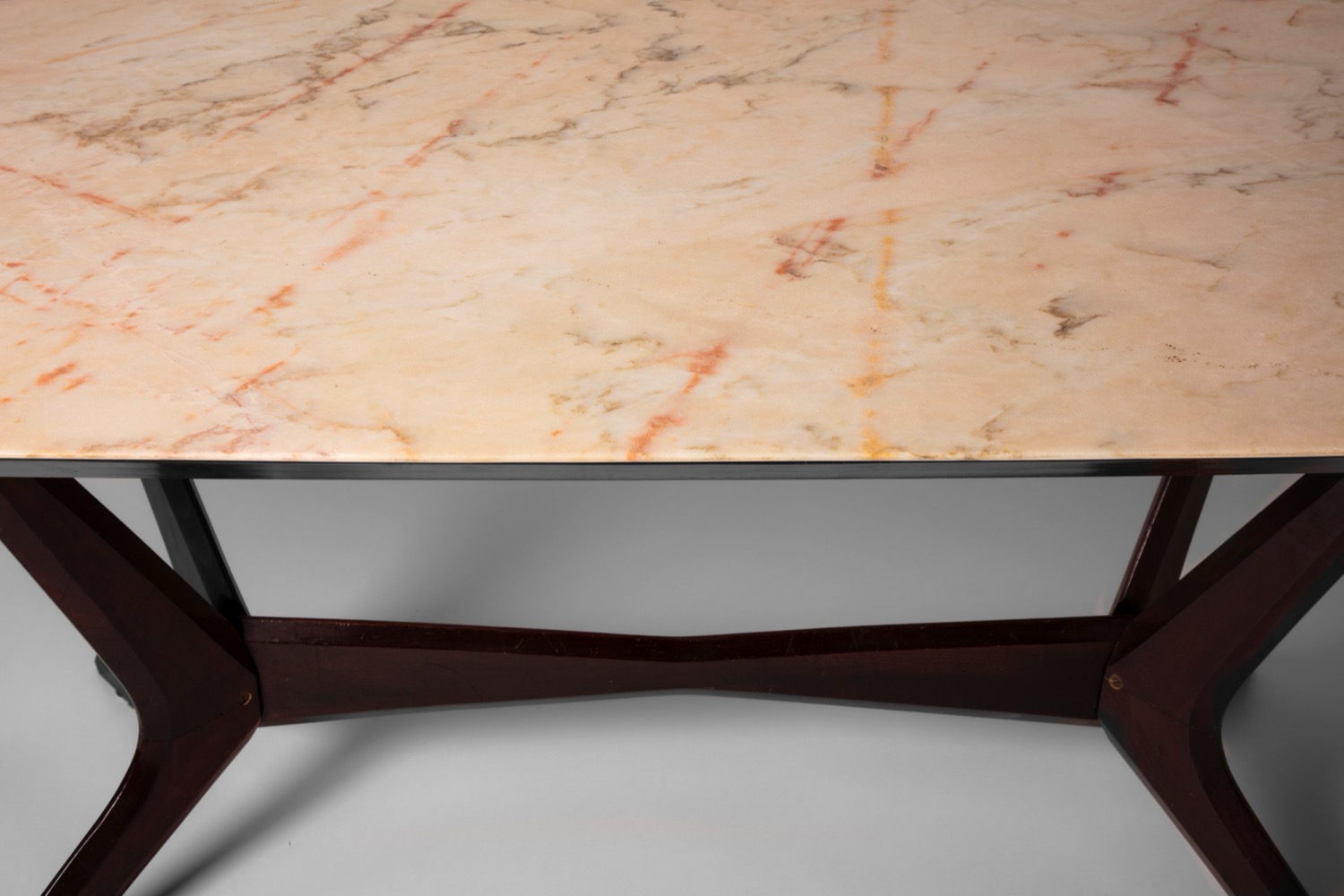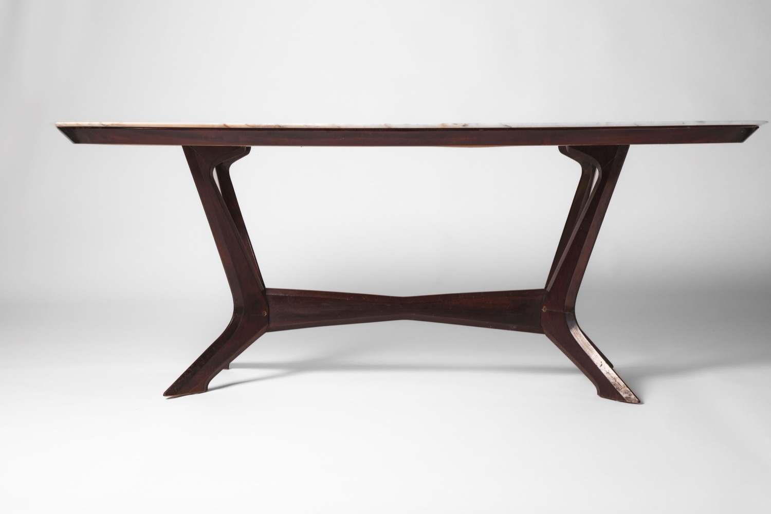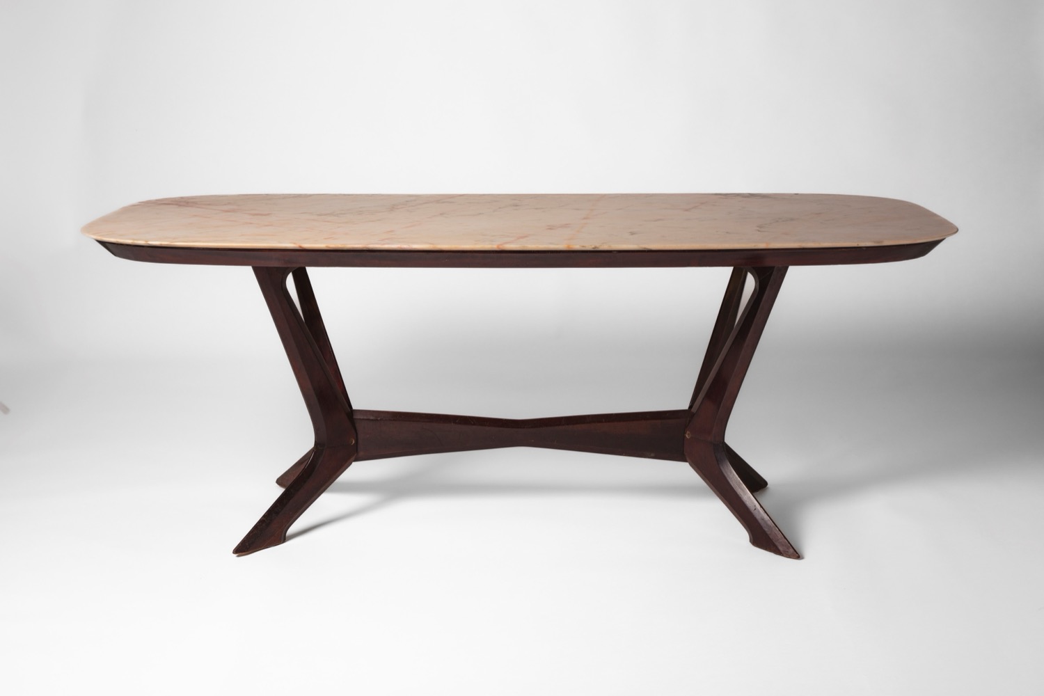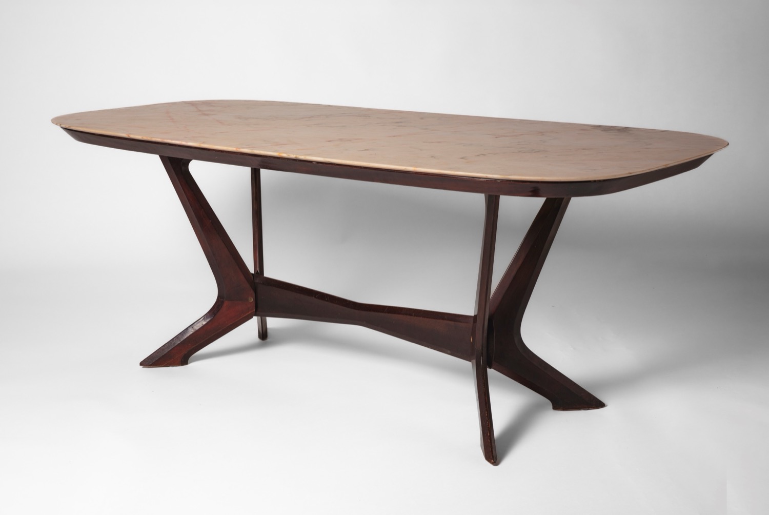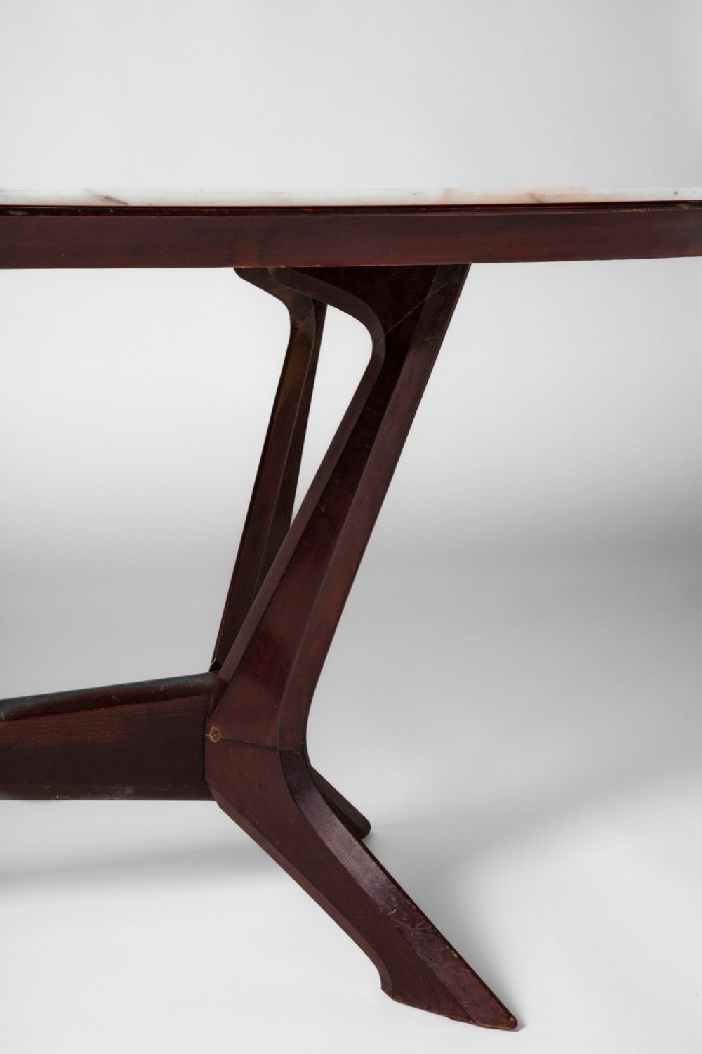 Grande tavolo da pranzo con piano in marmo e struttura scultorea in legno massello