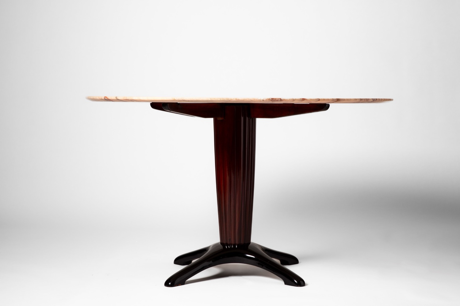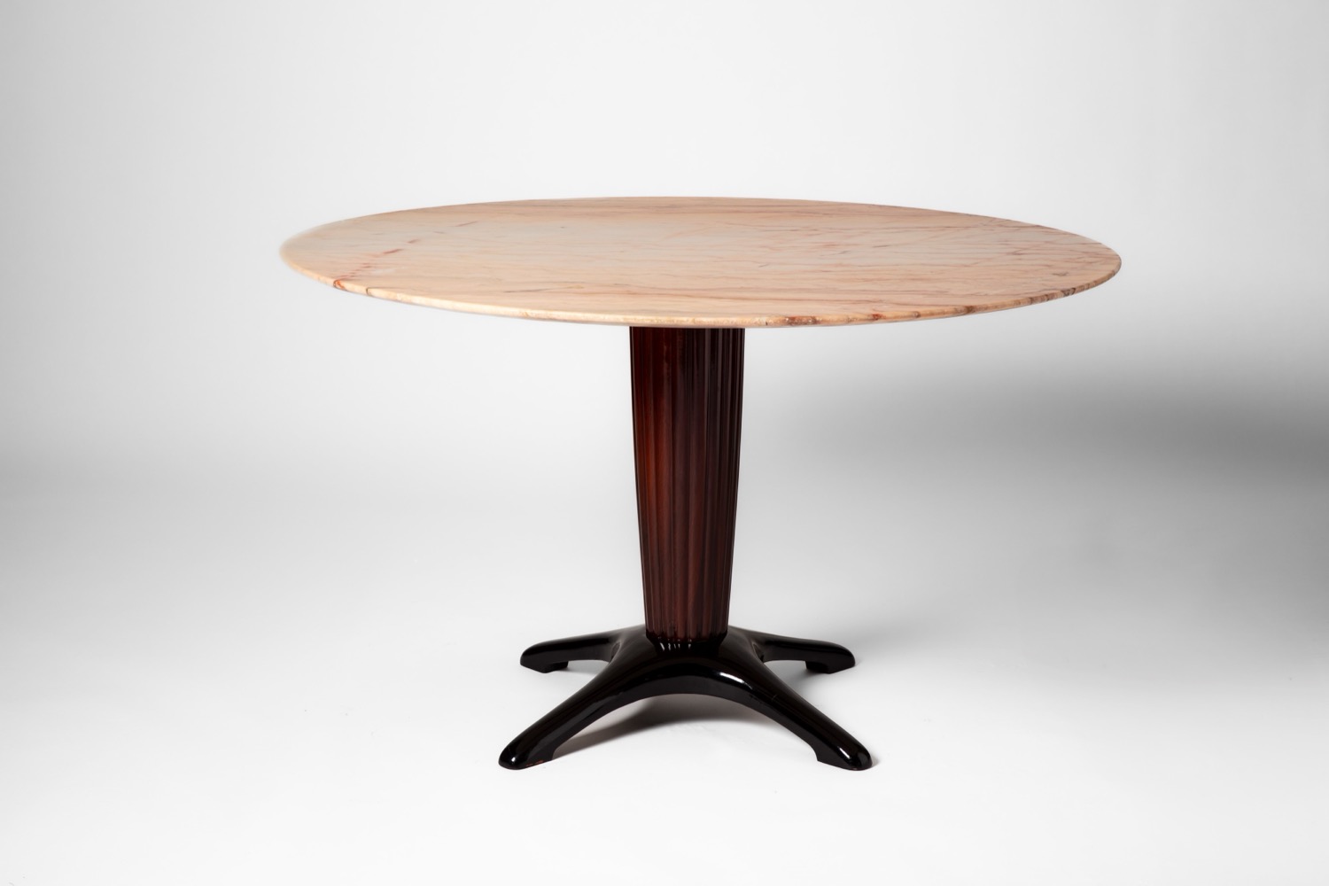 Tavolo da pranzo con piano circolare in marmo e struttura in legno ebanizzato