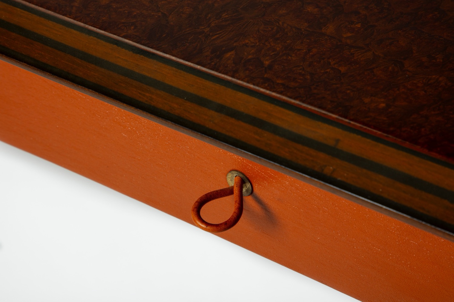 Legno, legno impiallacciato, pelle e dettagli in ottone