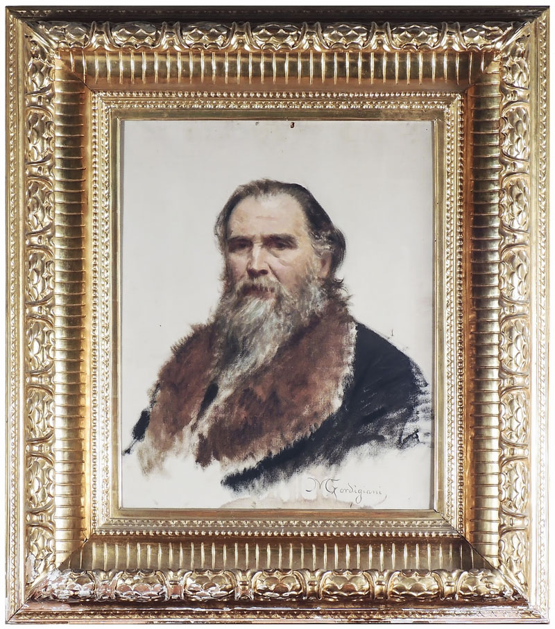 MICHELE GORDIGIANI (1835-1909) Ritratto di Giovanni Duprè da vecchio olio su tela, firmato, in cornice lievi difetti e piccole lacerazioni della tela cm 70,5x56 Bibliografia: Giovanni Duprè Scultore 1817-1882. Milano: 1917, in copertina PORTRAIT OF THE OLD GIOVANNI DUPRÈ, OIL ON CANVAS, PUBLISHED WORK