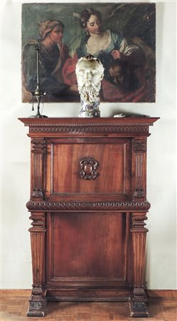 STIPO IN NOCE BIONDO FINE DEL XIX/INIZIO DEL XX SECOLO cappello modanato, fascia sottostante intagliata a greche, fronte dritto ad uno sportello a calatoio centrato da stemma gentilizio, lesene laterali a colonna scanalata, sostegni anteriori a faretra, quello posteriore a pannello scorniciato poggianti su base a cornice, difetti h cm 130,5x90,5x39