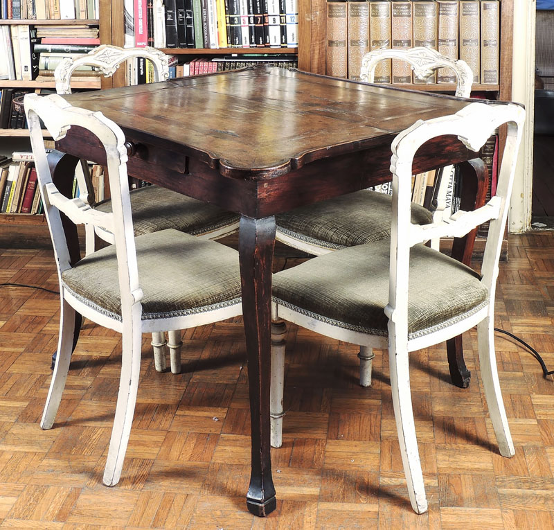 TAVOLINO DA GIOCO IN NOCE fine del XIX secolo piano sagomato, un cassetto...
