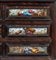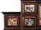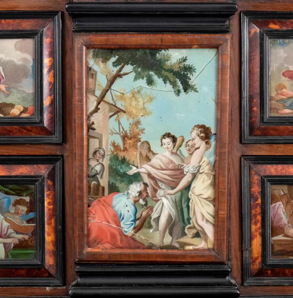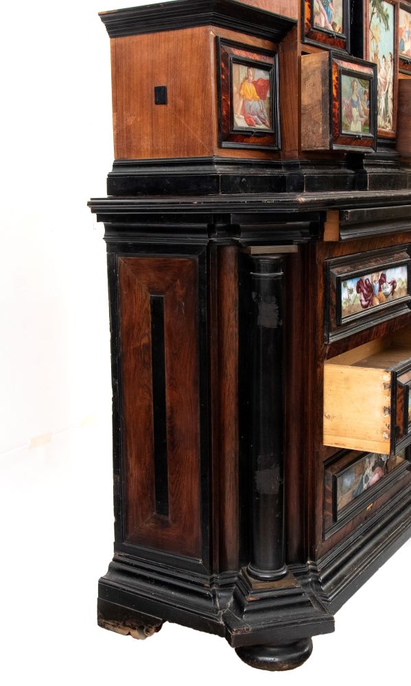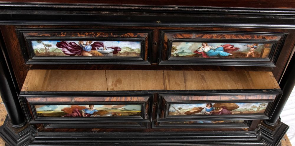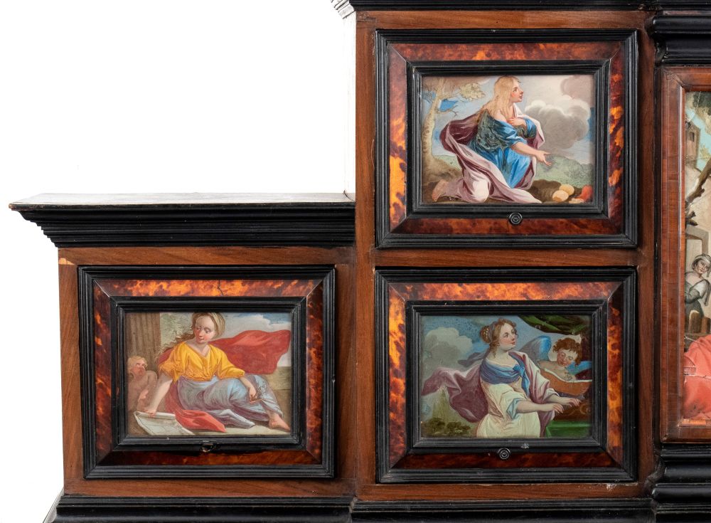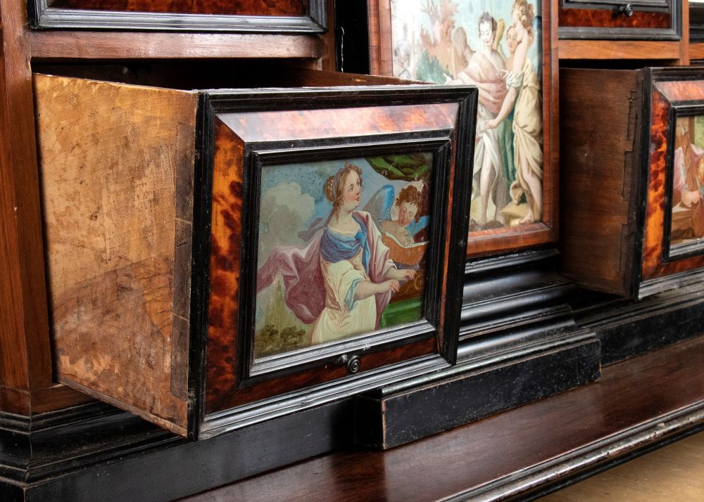 La parte inferiore a sei cassetti disposti su due file, dipinti sottovetro con scene classiche entro cornici in guscio di tartaruga (hawksbill sea turtle, Eretmochelys imbricata, Cheloniidae); la parte soprastante con sei cassetti disposti simmetricamente tre a tre ad affiancare un vano chiuso centrale, anch’essi dipinti sottovetro con scene classiche entro cornici in guscio di tartaruga (hawksbill sea turtle, Eretmochelys imbricata, Cheloniidae).
