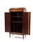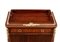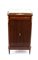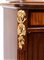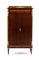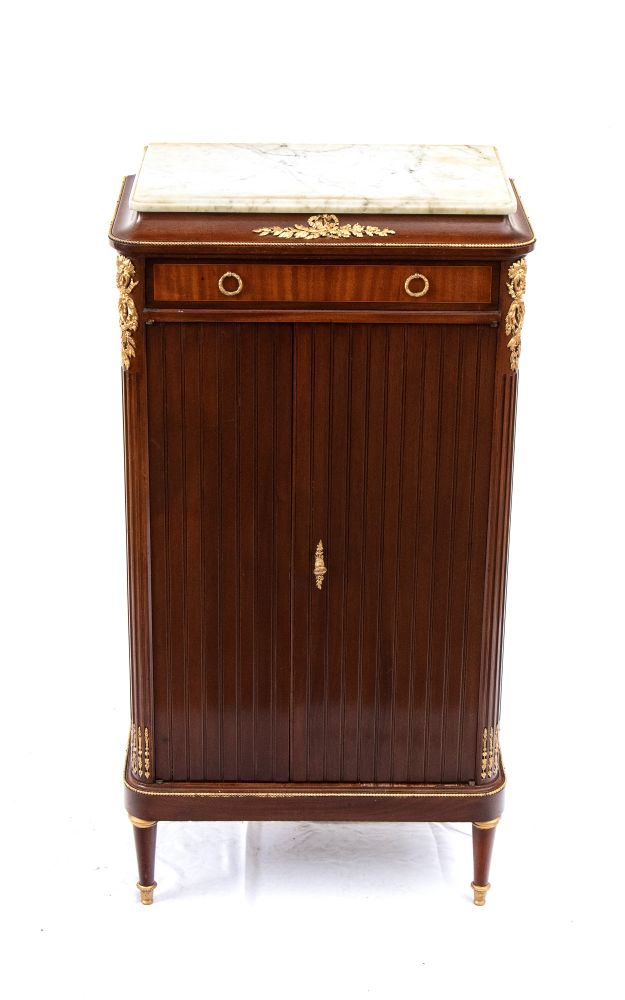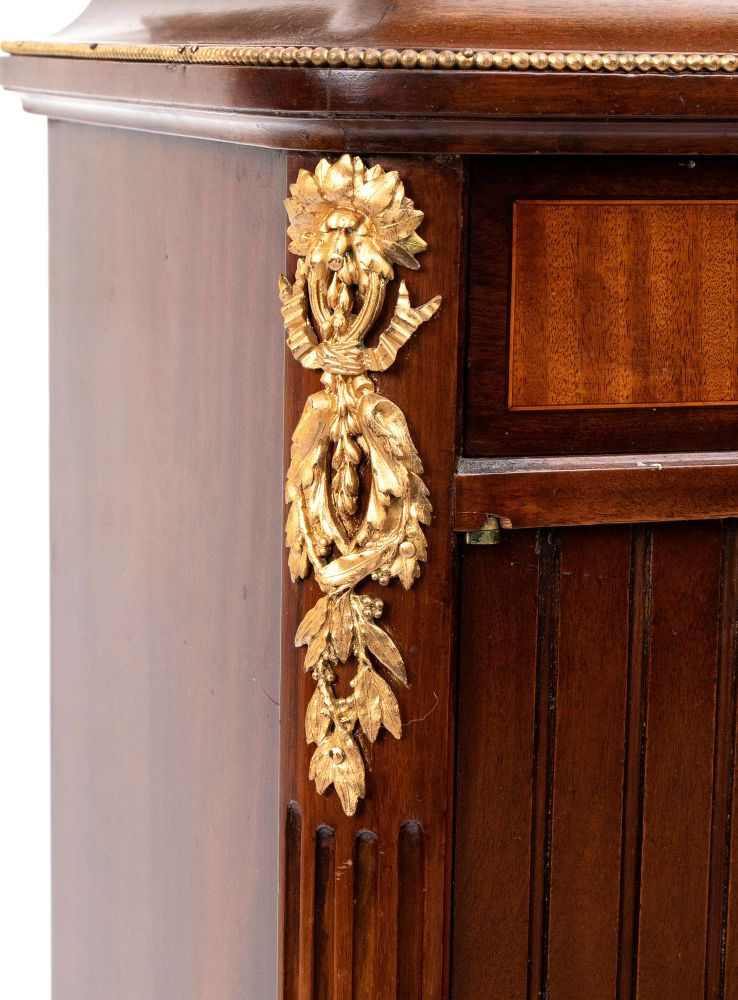 interamente impiallacciato in mogano con applicazioni in bronzo dorato; fronte a due ante con cassetto sottopiano, piano in marmo rimovibile a celare un vano segreto.