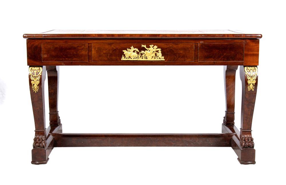 Scrivania Impero francese in mogano XIX secolo Altezza x larghezza x profondità: 74 x 128 x 66 cm. Due alette estraibili da 39 cm cadauno.