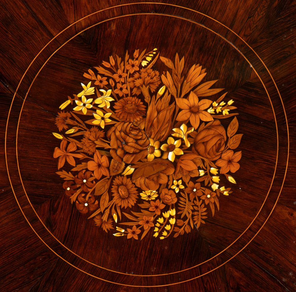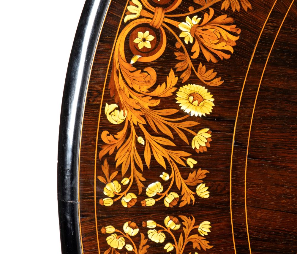 in legno di palissandro (Dalbergia spp), finemente intarsiato in osso e legni di frutto a motivi floreali, sul bordo e nella parte centrale. Il piano è sorretto da una base tripodein legno di noce nel classico stile vittoriano.