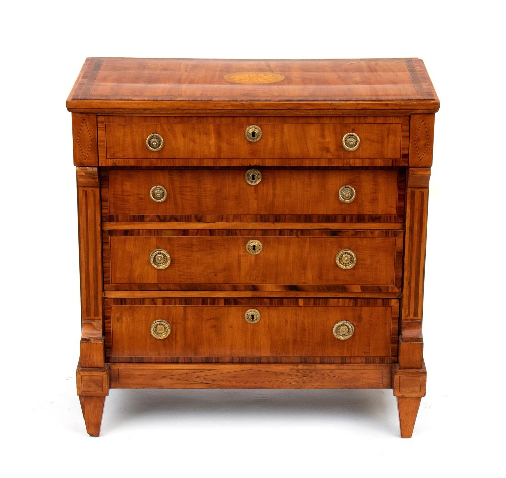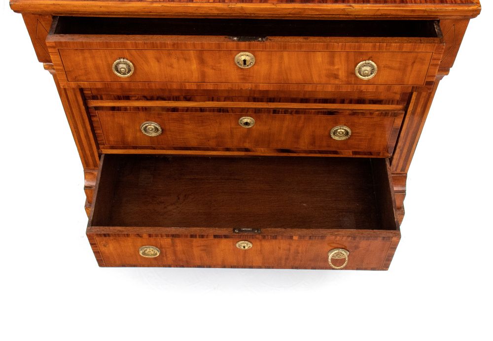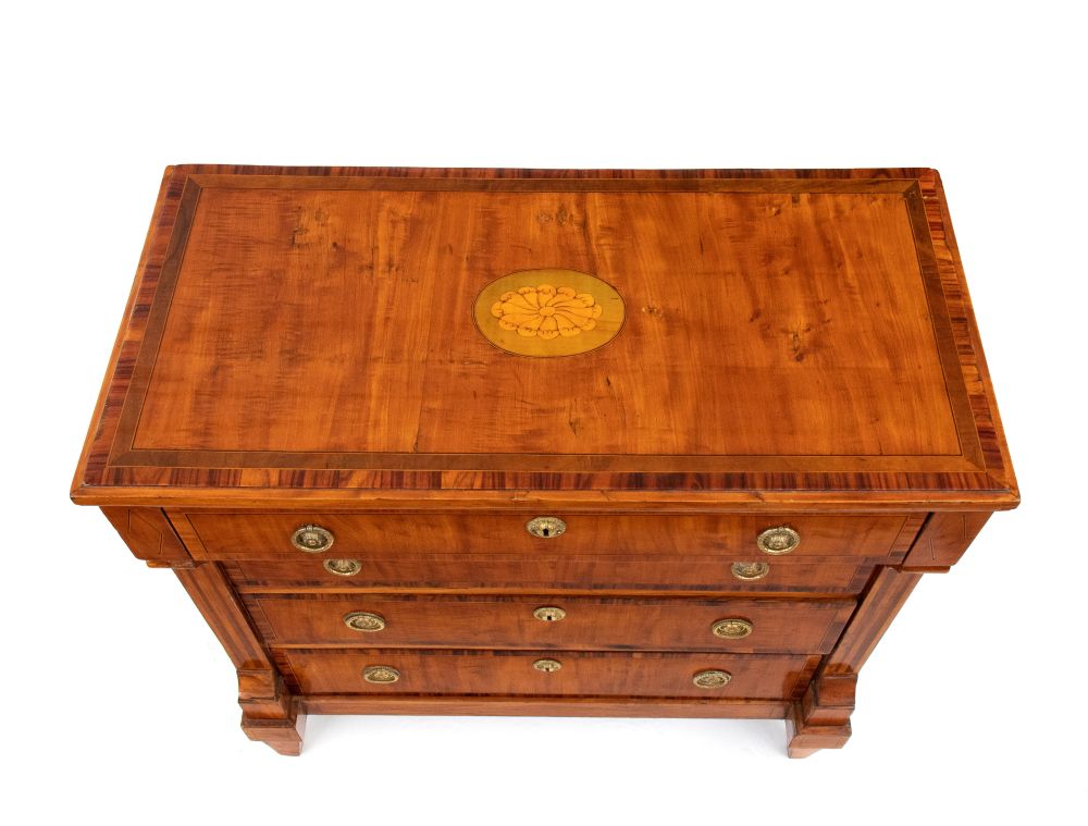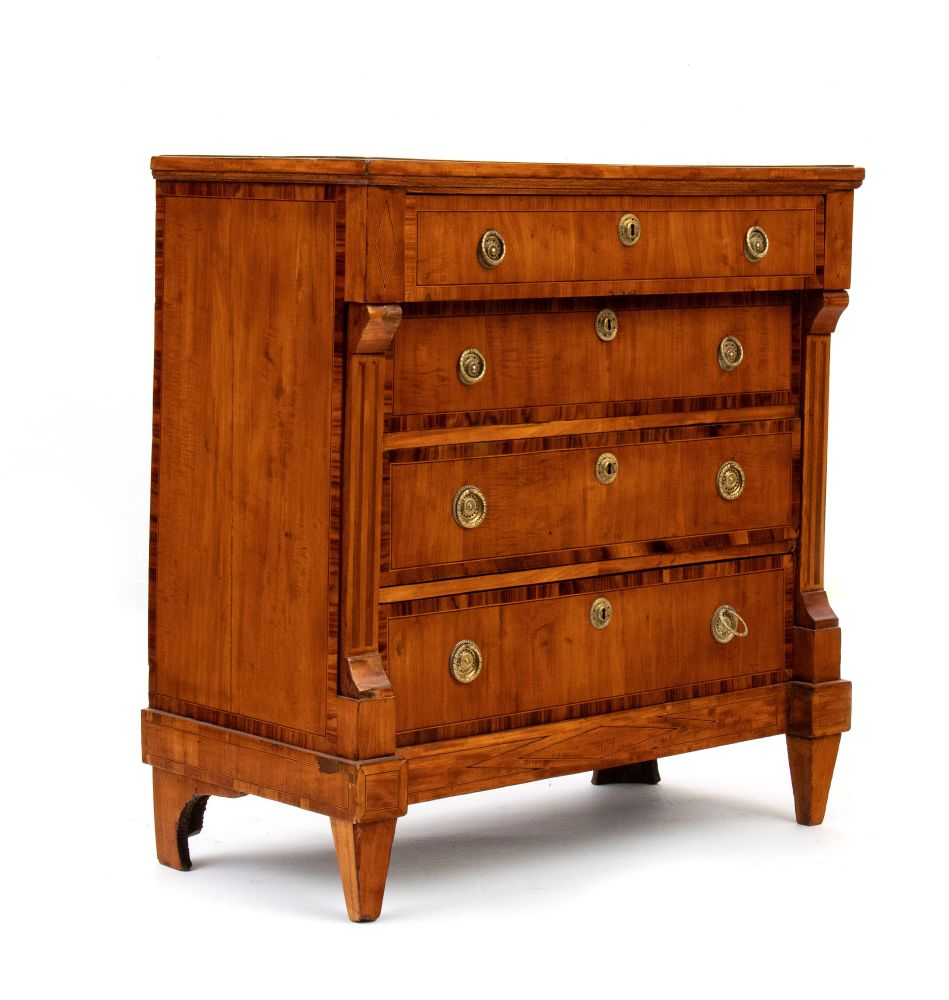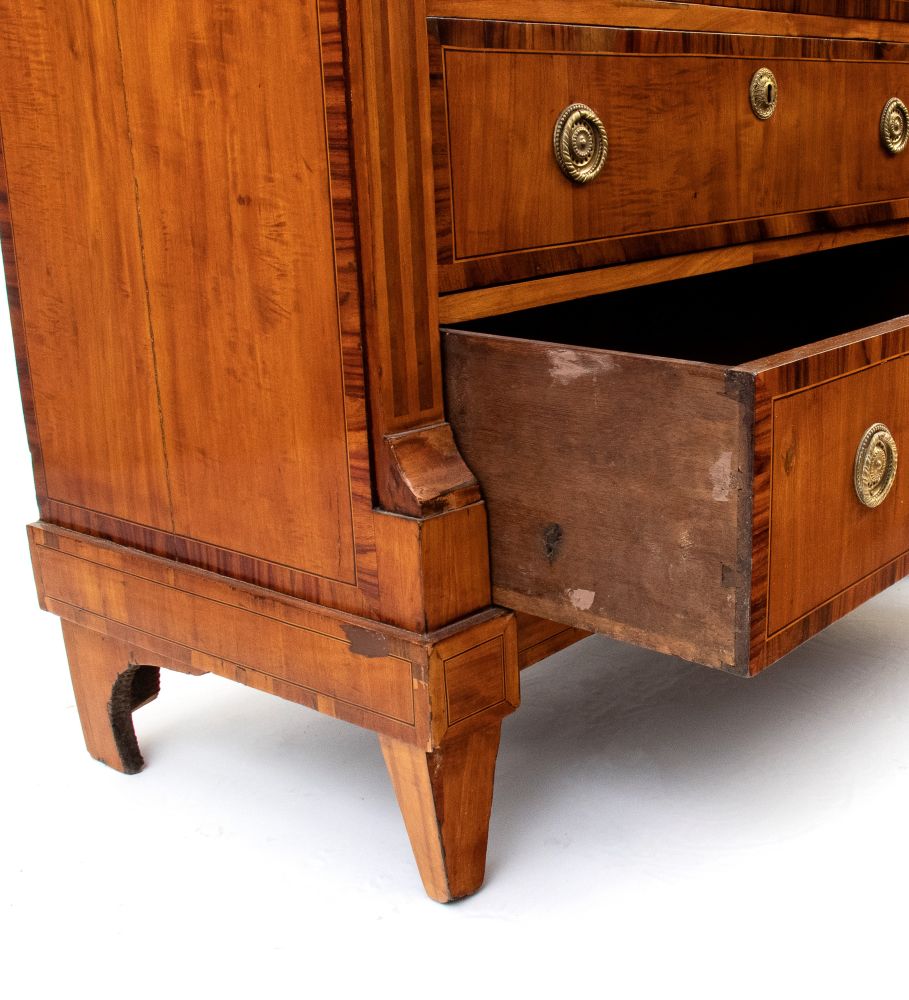 a quattro cassetti in legno di mogano, intarsiato in legni di frutto a motivi geometrici e al centro del piano con un classico intarsio alla maniera di Thomas Sheraton, difatti questo mobile era prodotto per il mercato Inglese, il mobile è impreziosito da un intarsio sul bordo cassetti e piano in legno di calamandra. Maniglie e bocchette in bronzo dorate, sui lati due lesene che si vanno a raccordare sulla traversa bassa e il mobile viene sorretto da gambe tronco piramidali.