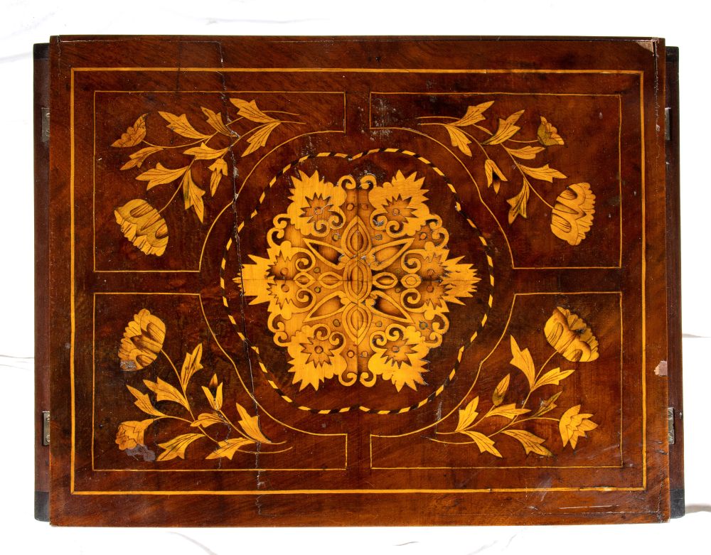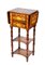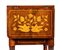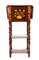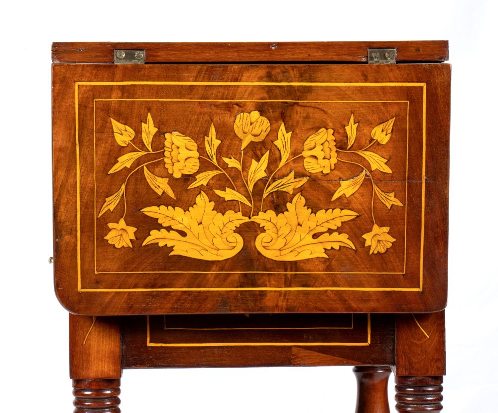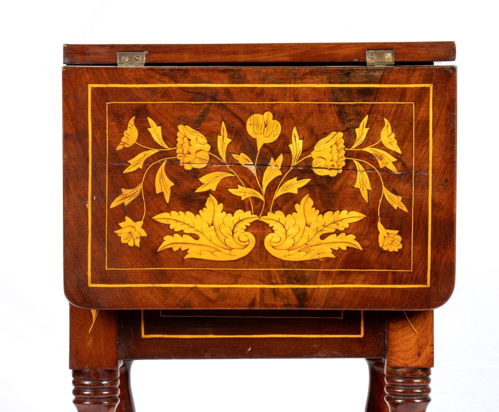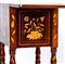da centro, in mogano e piuma di mogano, con due alette laterali, due cassetti e due ripiani. Completamente intarsiato a motivi floreali in legno di bosso.
