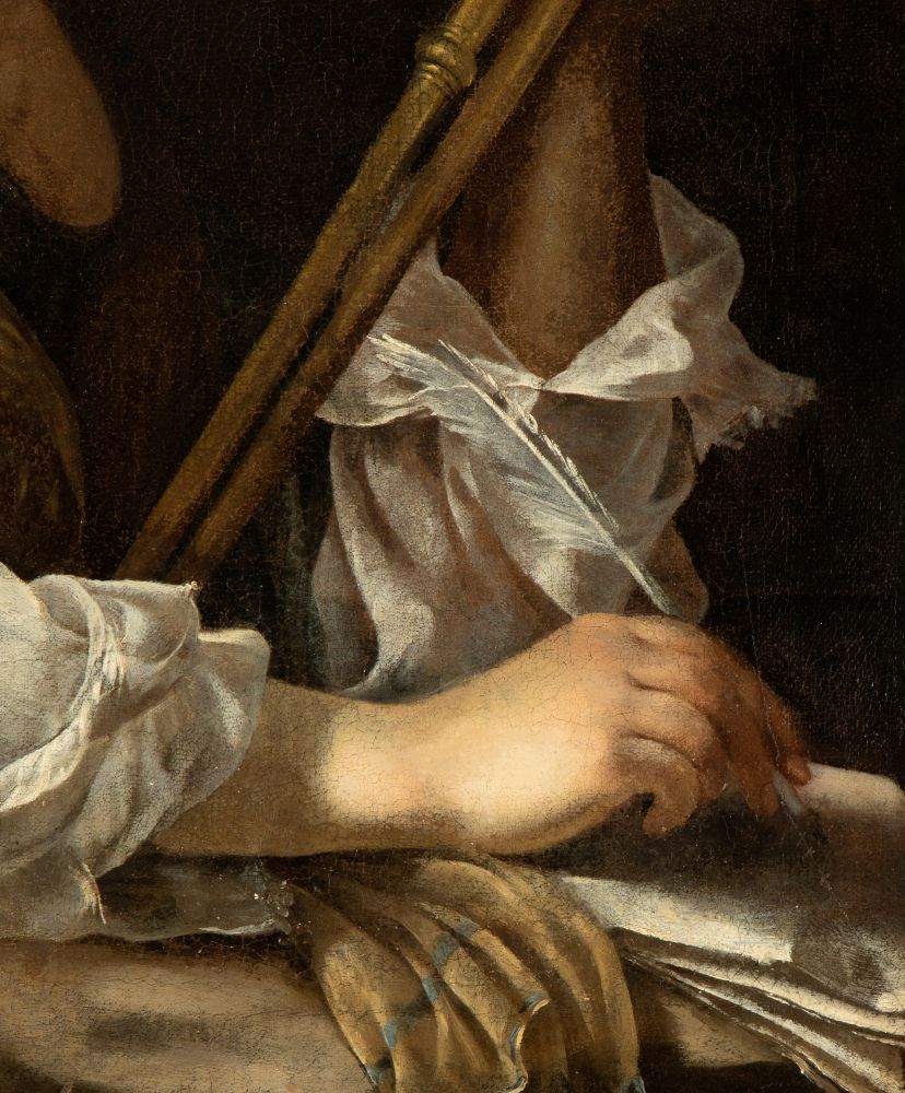 Questa bella composizione, incentrata sulla figura allegorica femminile, si allinea alla galleria di giovinette aggraziate e malinconiche concepite dal raffinato pennello di Bernardo Cavallino. L'immagine può essere interpretata sia come raffigurazione di Euterpe, musa della musica e della poesia lirica, sia come Allegoria della musica: due letture che in realtà possono senz'altro coesistere arricchendosi vicendevolmente. Pur facendo perno esclusivo sul busto della fanciulla seduta, intenta a scrivere con la mano destra mentre la sinistra regge un po' faticosamente una tromba naturale barocca, la composizione risulta attentamente studiata, con l'accurata torsione del busto e della testa e lo strumento che sembra seguire in parallelo la diagonale delineata dal collo e dalla testa, mentre la monumentale colonna sinistra conferisce equilibrio strutturale all'insieme. I tratti delicati e l'espressione vaga apparentano questa effige, astratta e avulsa da qualsiasi intento realistico, ad altre immagini di giovani donne eseguite da Cavallino, come le Allegorie della Pittura in collezioni private di Roma e Napoli, la Santa Caterina d'Alessandria del Barber Institute di Birmingham, la Santa Cecilia del Museum of Fine Art di Boston o la Santa Cristina del Blanton Museum di Austin, Texas.