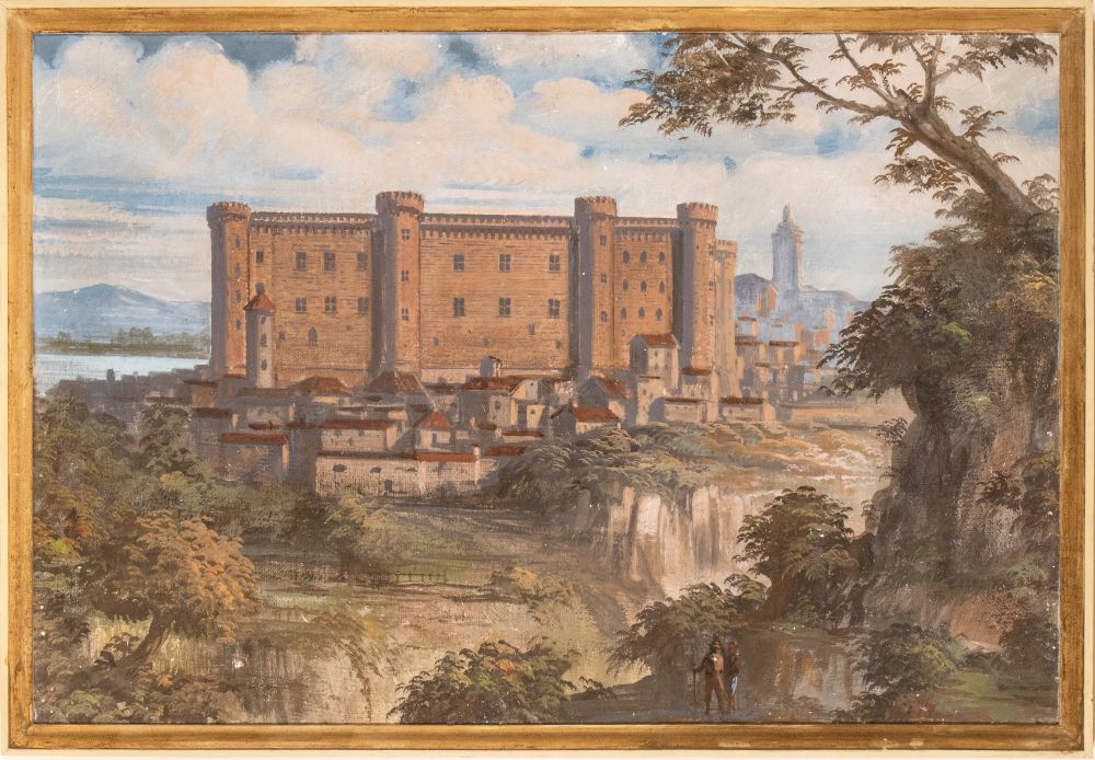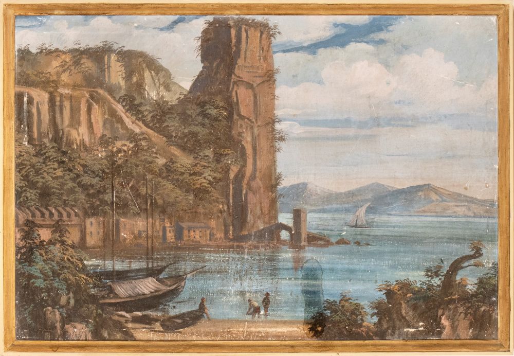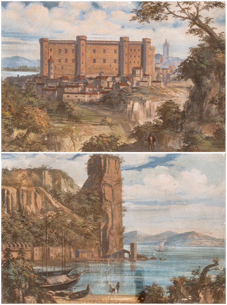 a) Veduta del castello di Bracciano; b) Veduta del golfo Terracina con la Roccia del Pesce. Coppia di dipinti