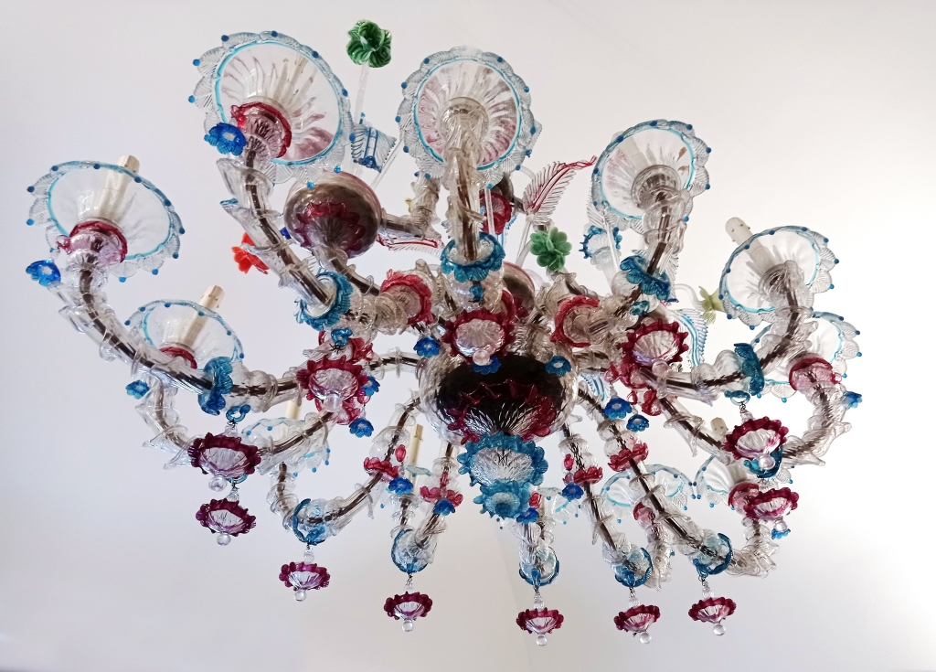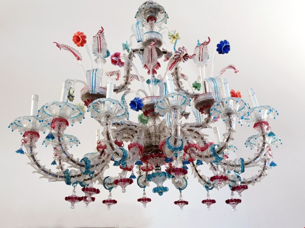 Modello Cà Rezzonico a 12 luci. Opera di alta scuola, in vetro cristallino, con fiori in pasta vitrea policroma.