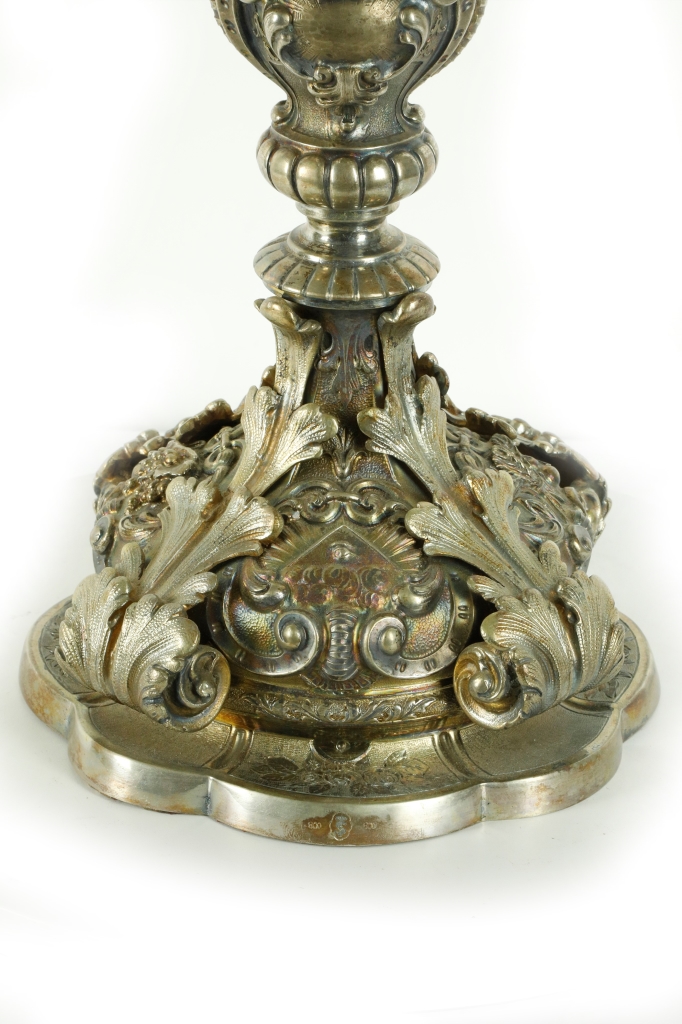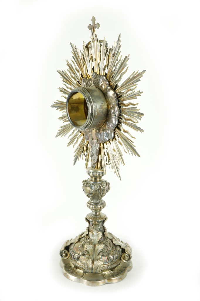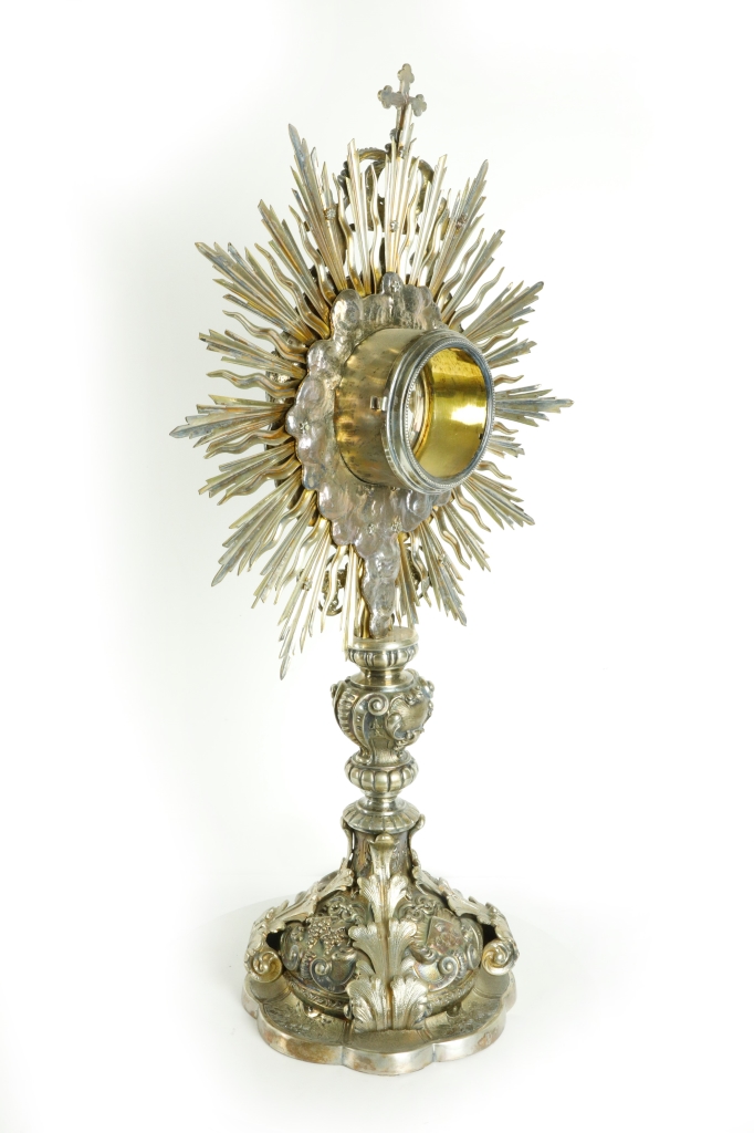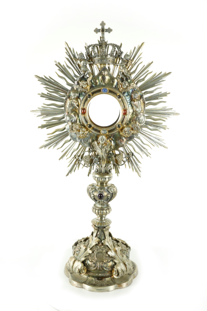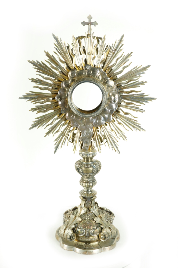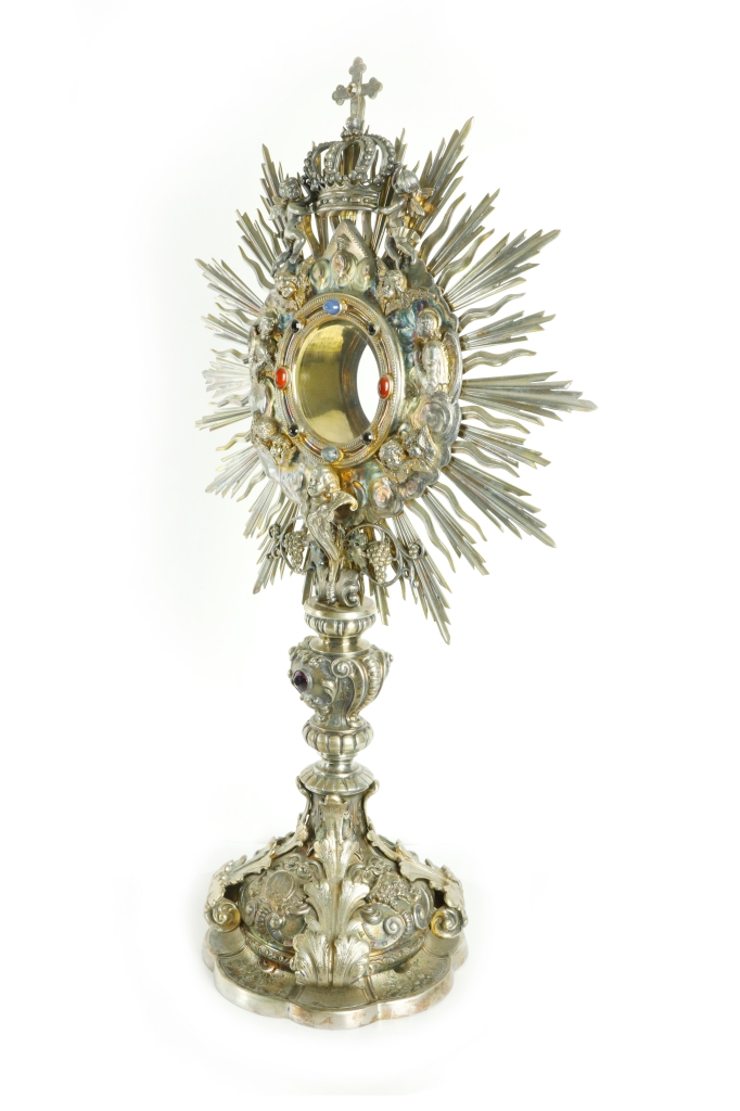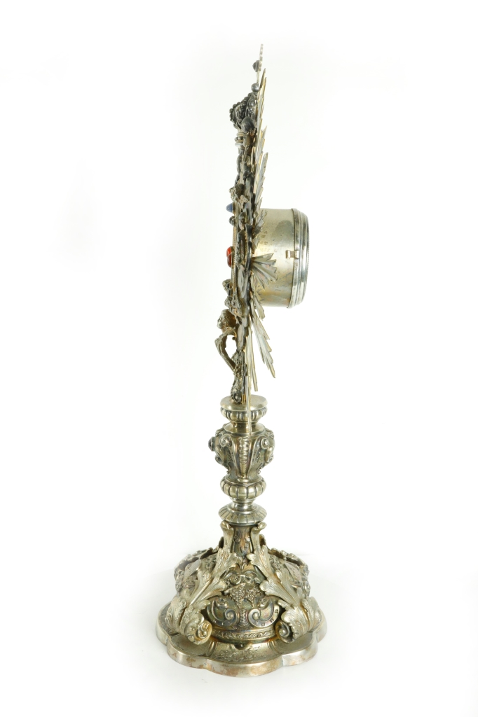 Antico ostensorio da parata in argento sbalzato, cesellato ed in parte dorato. Manifattura romana fine del XVII secolo – inizi del XVIII altezza cm 60; peso g 2556