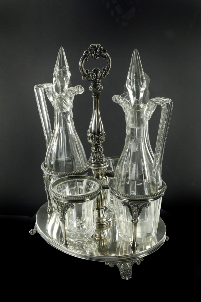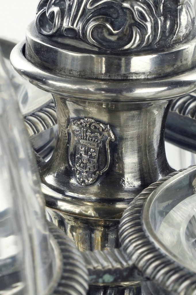 Servizio in argento e cristallo. Spagna XX sec. Argento Cm. h 33 x 26 x 18