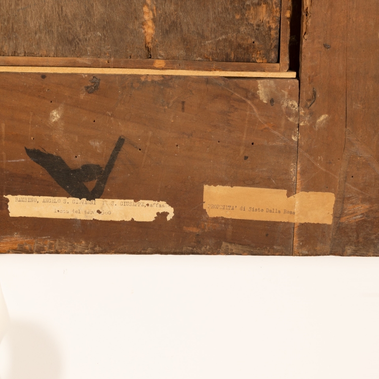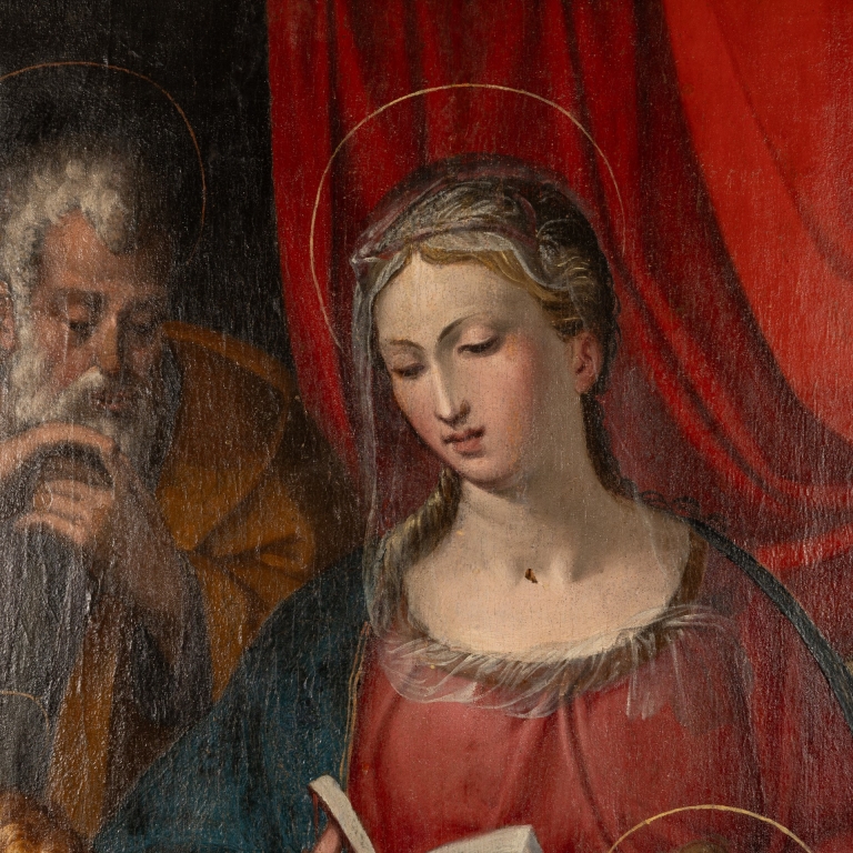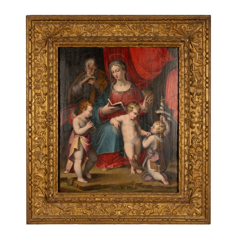Questa Sacra Famiglia su tavola e' stata gia' attribuita in passato come opera di Giovanni Battista Ramenghi, detto Bagnacavallo il giovane (Bologna, 1521 - 1601), figlio di Bartolomeo.