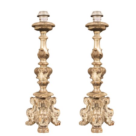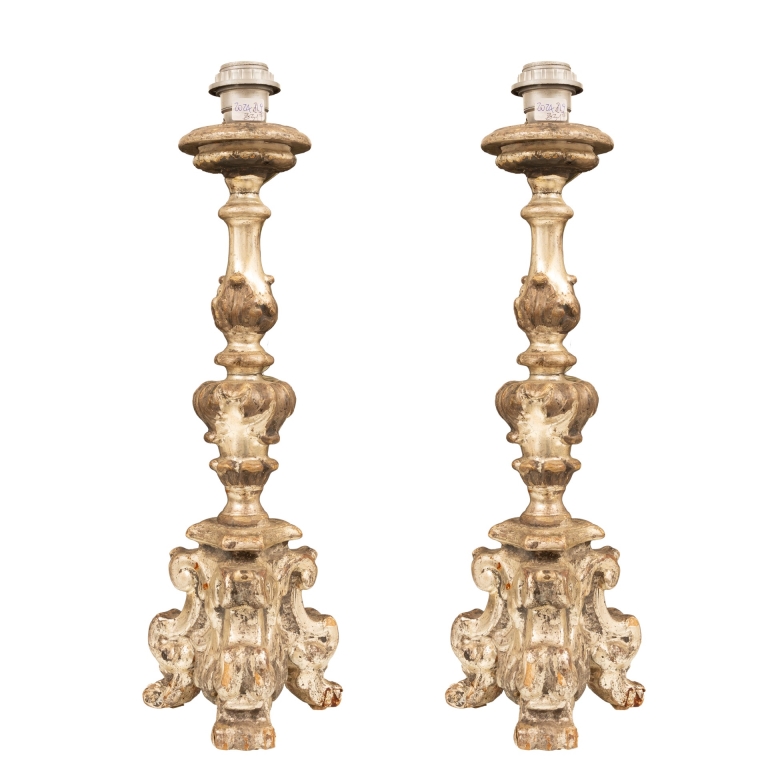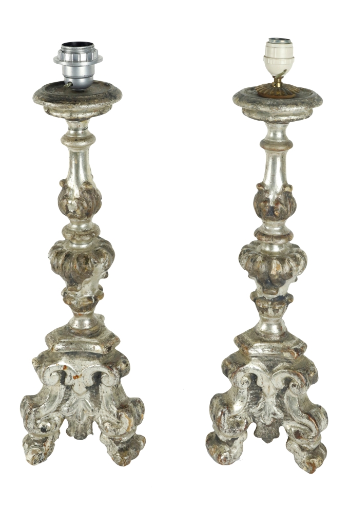 Coppia di candelieri in legno argentato Luigi XIV cm 54x16x13