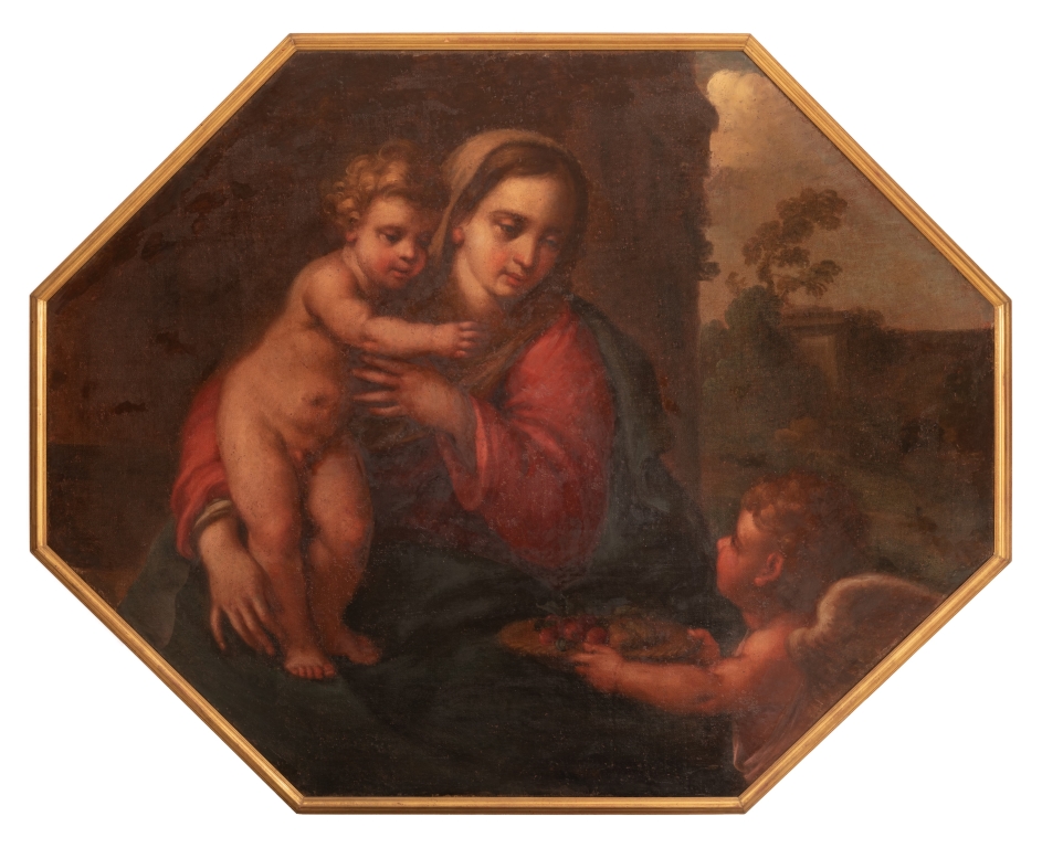 Previous Lot 344 Next Gliubich Casa d’Aste - Corso Vittorio Emanuele II 9, 67100 L'Aquila ASTA 33 - LOST AND FOUND ASTA 33 - LOST AND FOUND - SESSIONE II Thursday 26 June 2025 hours 15:00 (UTC +01:00) Madonna con Bambino e un angelo XVII secolo olio su tela ottagonale cm 118x203; con cornice 128x213 Scuola Emiliana