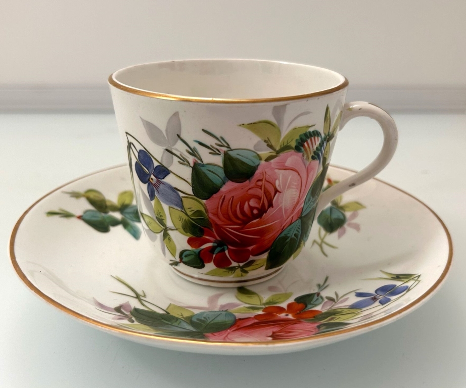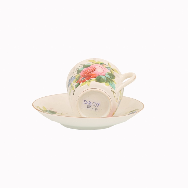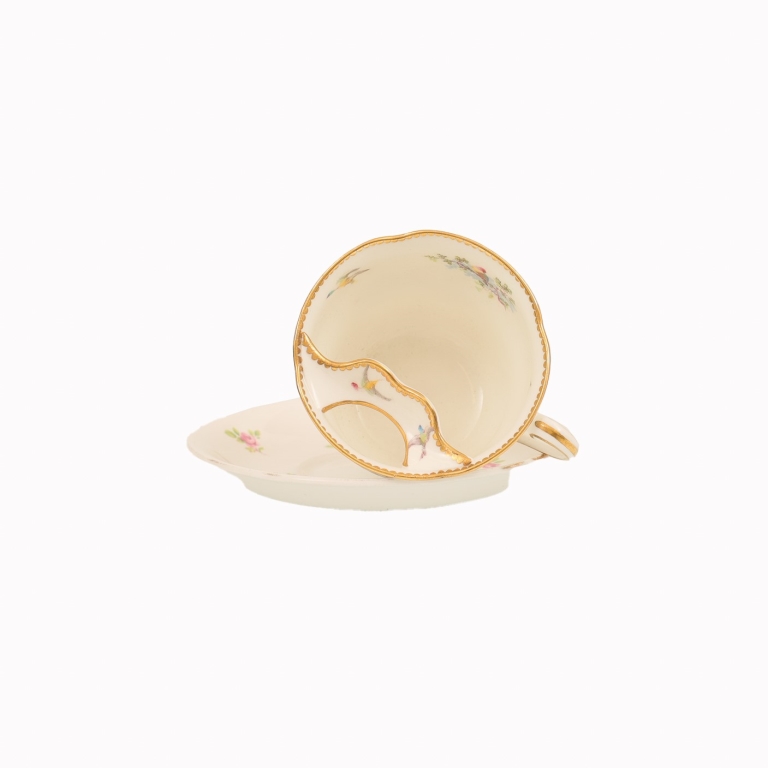Manifattura inglese dell'ultimo quarto del XIX secolo Tazza vittoriana per non bagnare i baffi altezza cm 8; diametro piattino cm 17