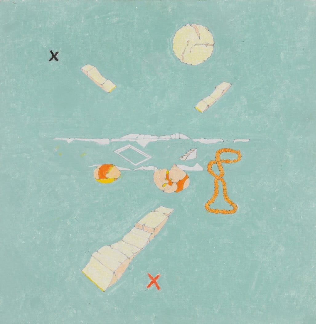 Gianfranco Baruchello, 1924-2023 , olio su tela 2001, cm 50 x 50: timbro archivio Roma sul retro del telaio, titolo “la situazione odierna nei territori del presque-rien”, firmato e datato