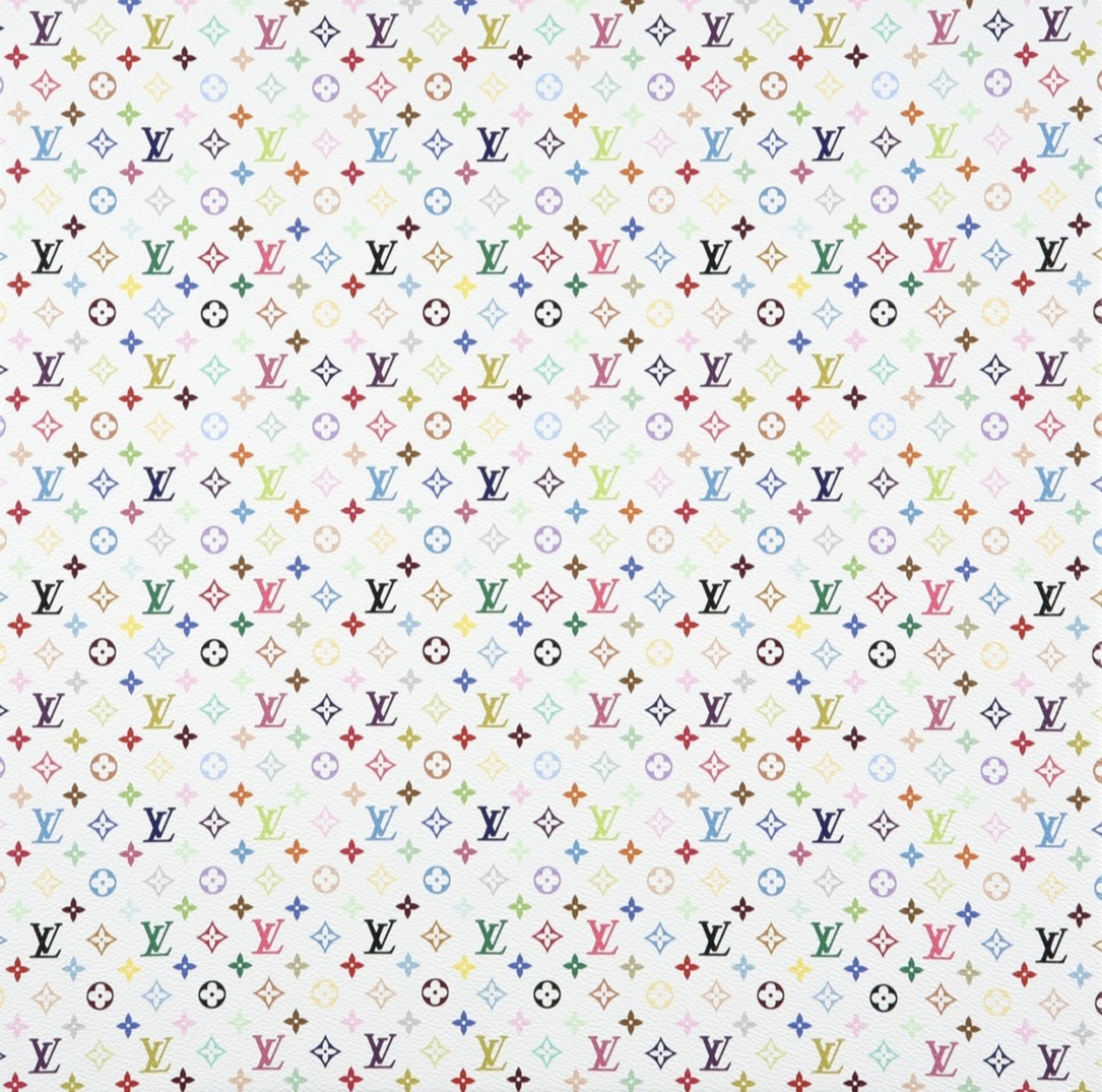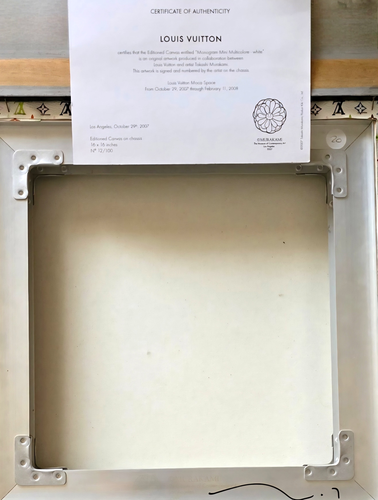 Takashi Murakami, 1962, Louis Vuitton Monogram multicolore Withe serigrafia su tela edizione 12/100, cm 40 x 40: Firma e numerazione al retro sul telaio in alluminio montata dall’artista, Louis Vuitton Moca space from October 29, 2007 througt 11, 2008, Certificato di autenticità al retro, in scatola monogrammata originale