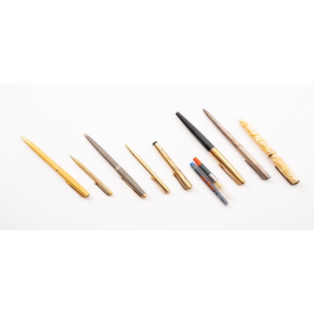 Penna Aurora 98 a sfera placcata in oro entro custodia , penna Aurora a sfera in argento 925 entro custodia, penna Parker 75 a sfera in sterling, penna Parker 45 stilografica in lacca nera entro custodia, penna Astura stilografica in celluloide, penna stilografica laminata in oro con pennino in oro 9 KT, matita laminata in oro e portamine Kosca in metallo dorato entro custodia (usure).